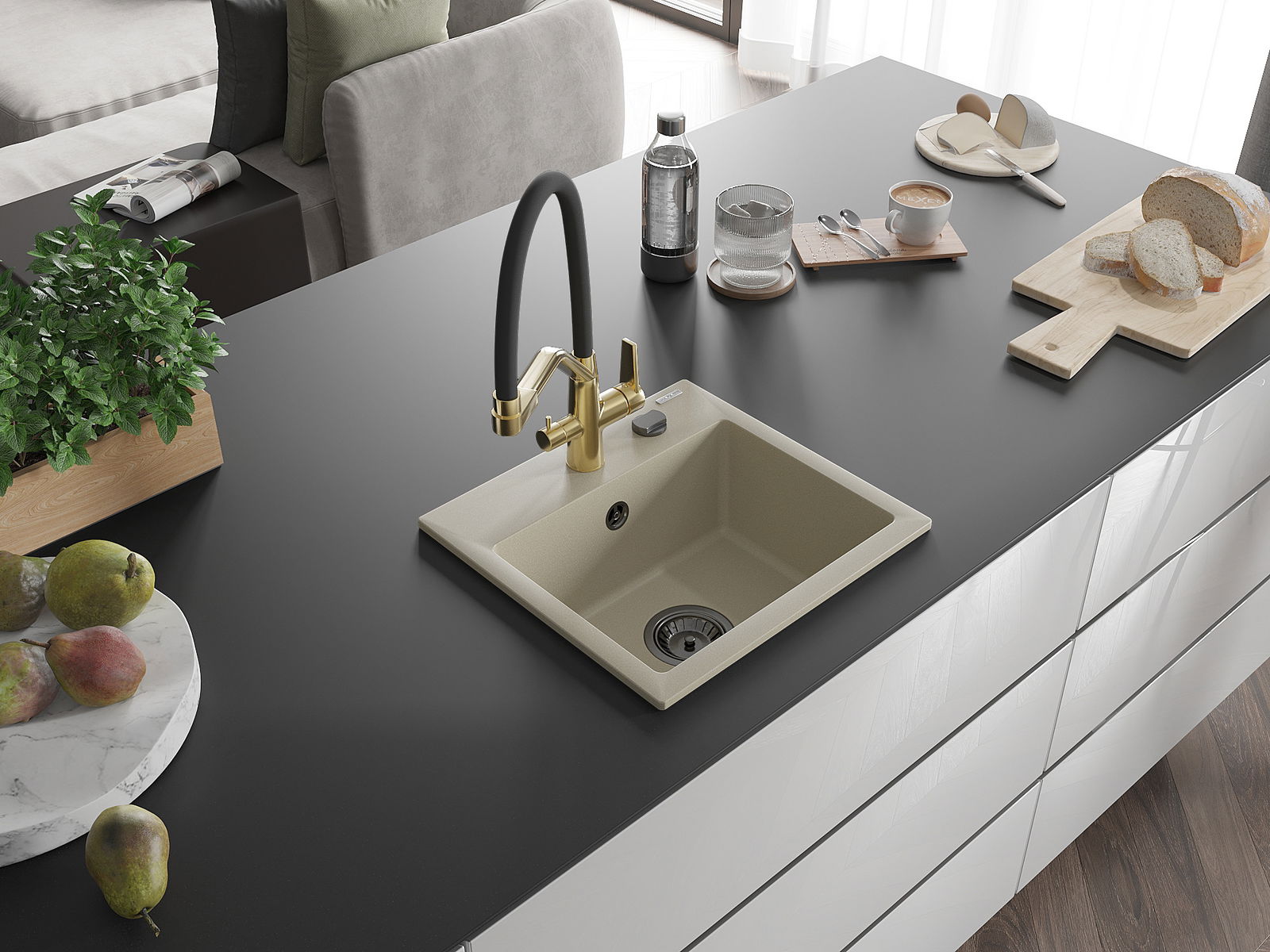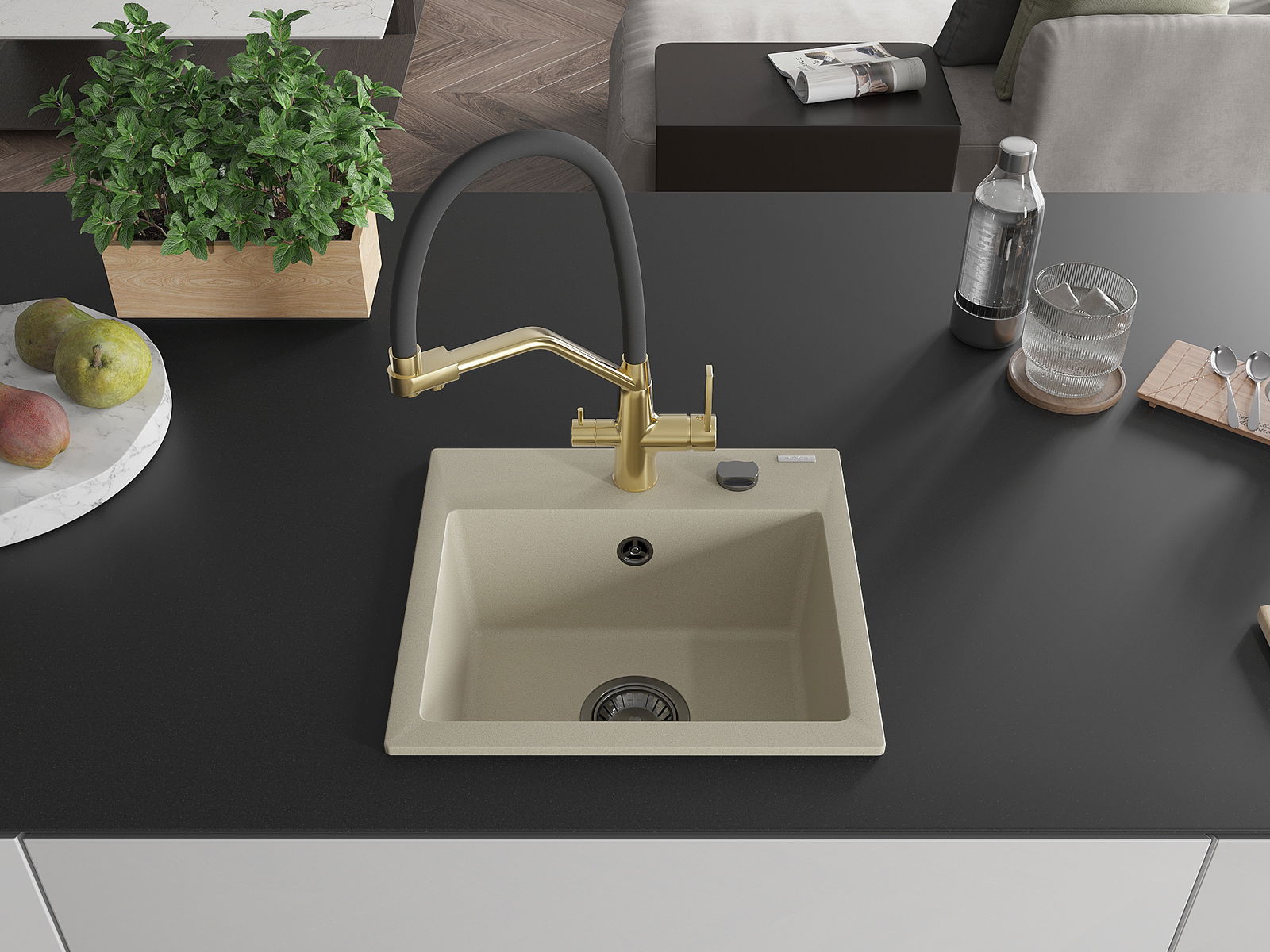 Drez má predfrézovaný otvor s priemerom 35 mm na samostatné prerazenie. Môže sa využiť napríklad na montáž dávkovača na tekutinu, ktorý eliminuje prítomnosť plastových fliaš v kuchyni a pridáva jej elegantné dokončenie.