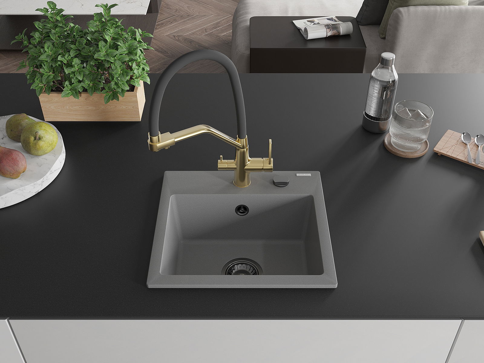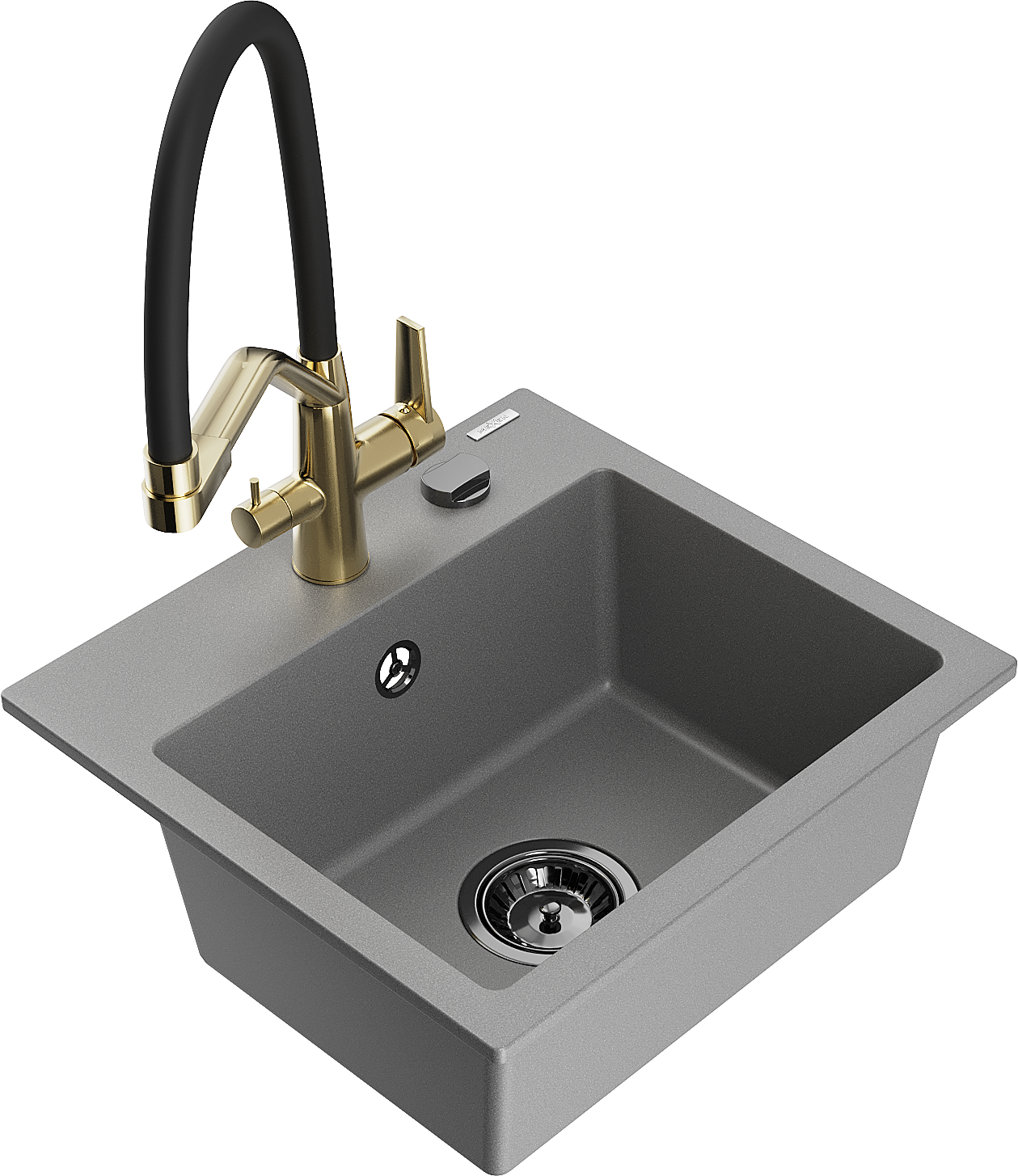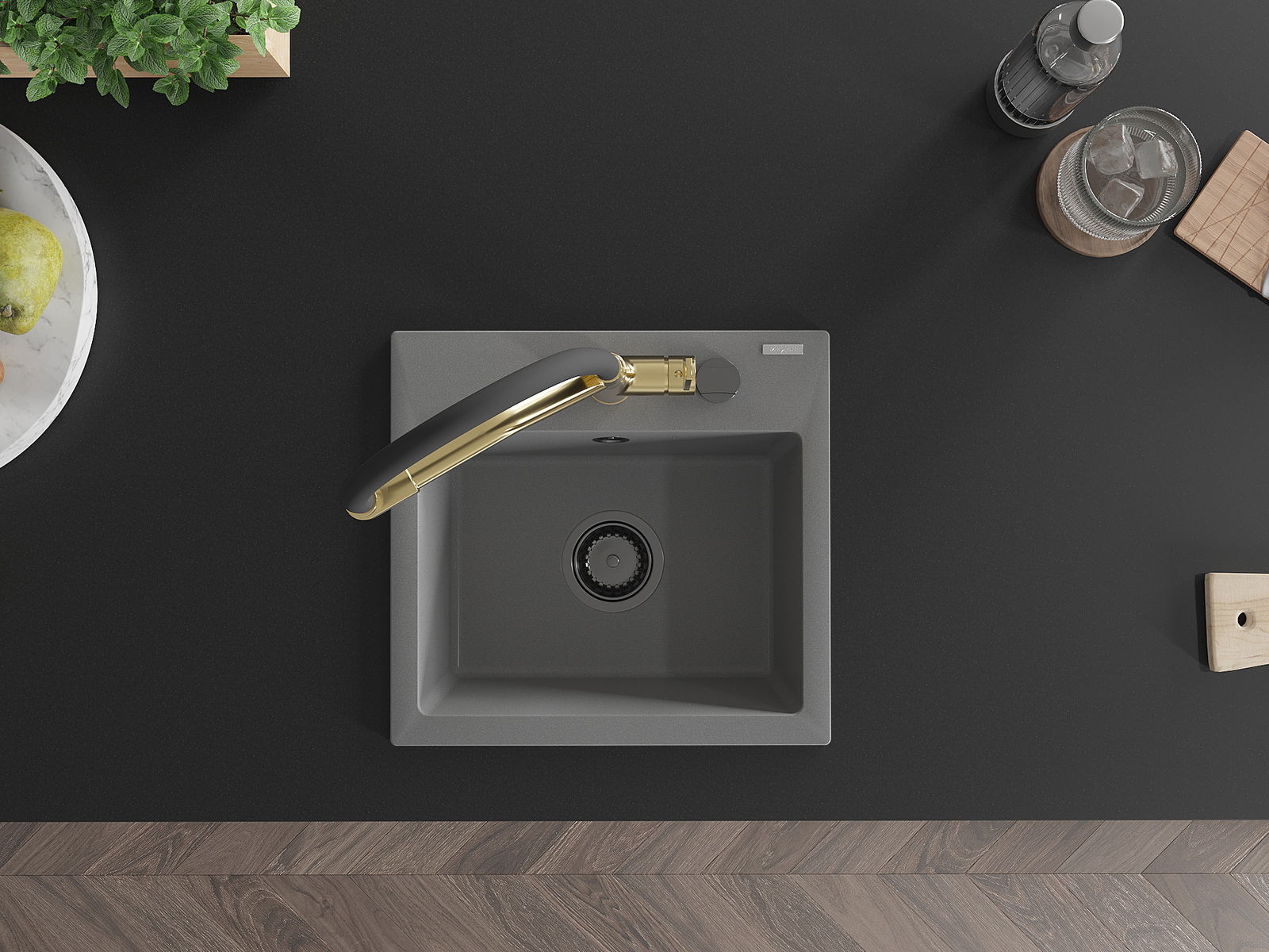 Mexen Milo granitový kuchynský drez 1-komorový s kuchynskou batériou Duo, sivý - 6505-71-671701-57-B