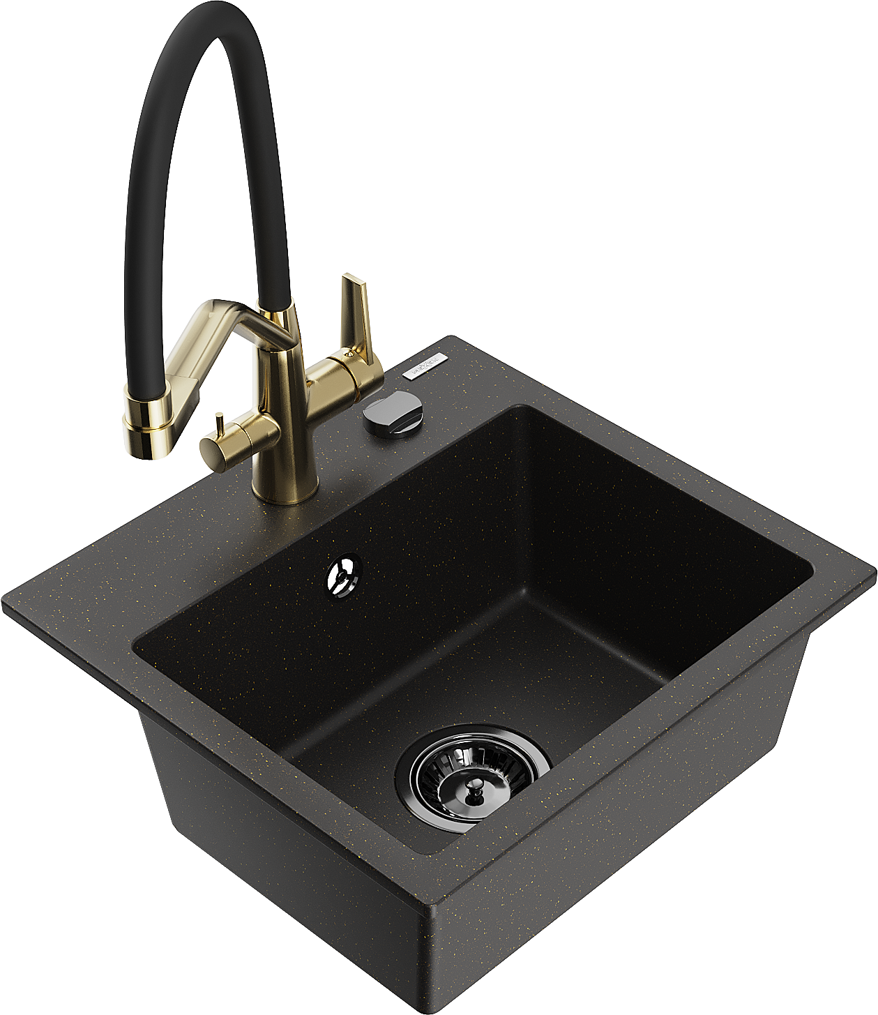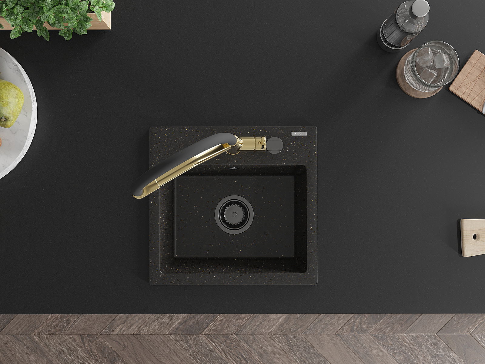 Mexen Milo granitový kuchynský drez 1-komorový s kuchynskou batériou Duo, čierny/zlatý metalik - 6505-75-671701-57-B