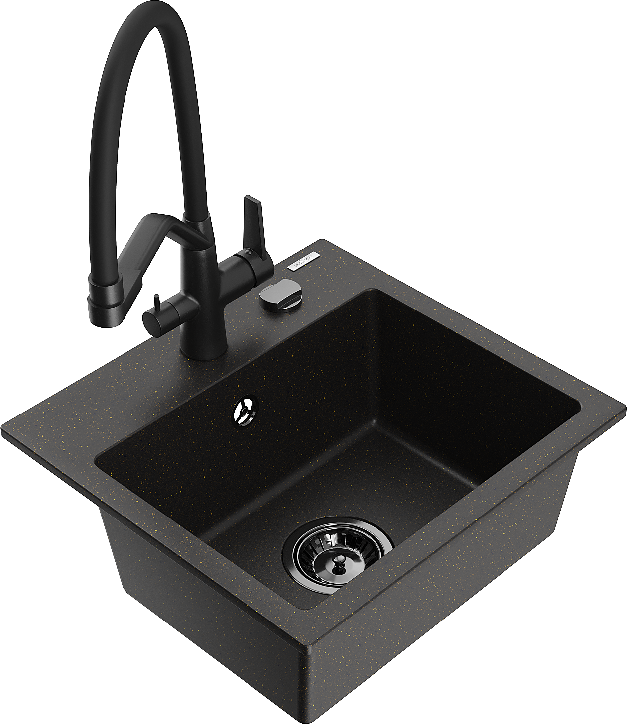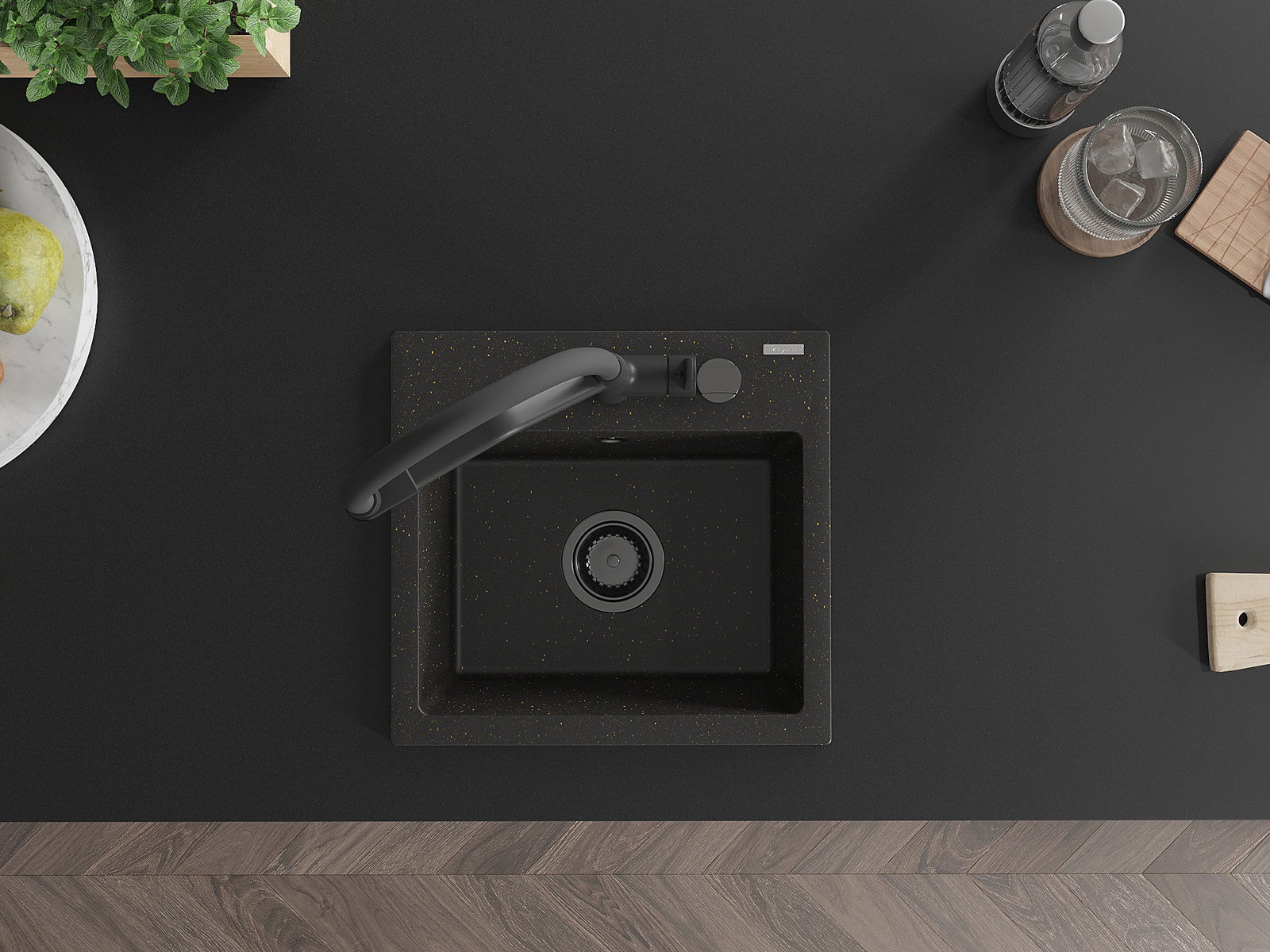 Mexen Milo žulový drez 1-komorový s kuchynskou batériou Duo, čierny/zlatý metalík - 6505-75-671701-70-B