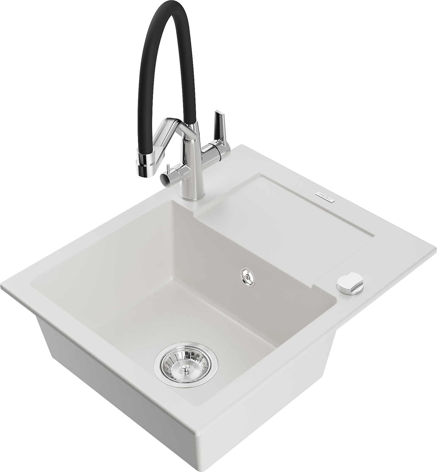 Mexen Enzo kuchynský drez granitový 1-komorový s odkvapkávacou plochou a kuchynská batéria Duo, biela - 6506-20-671701-07