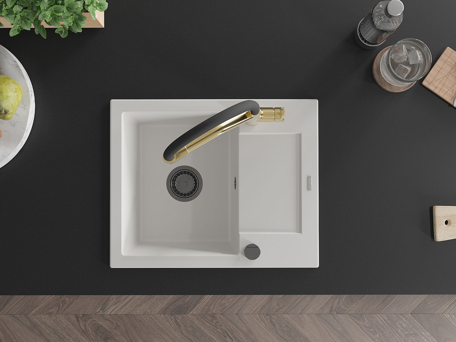 Mexen Enzo granitový kuchynský drez 1-komorový s odkvapkávačom a kuchynskou batériou Duo, biely - 6506-20-671701-57-B