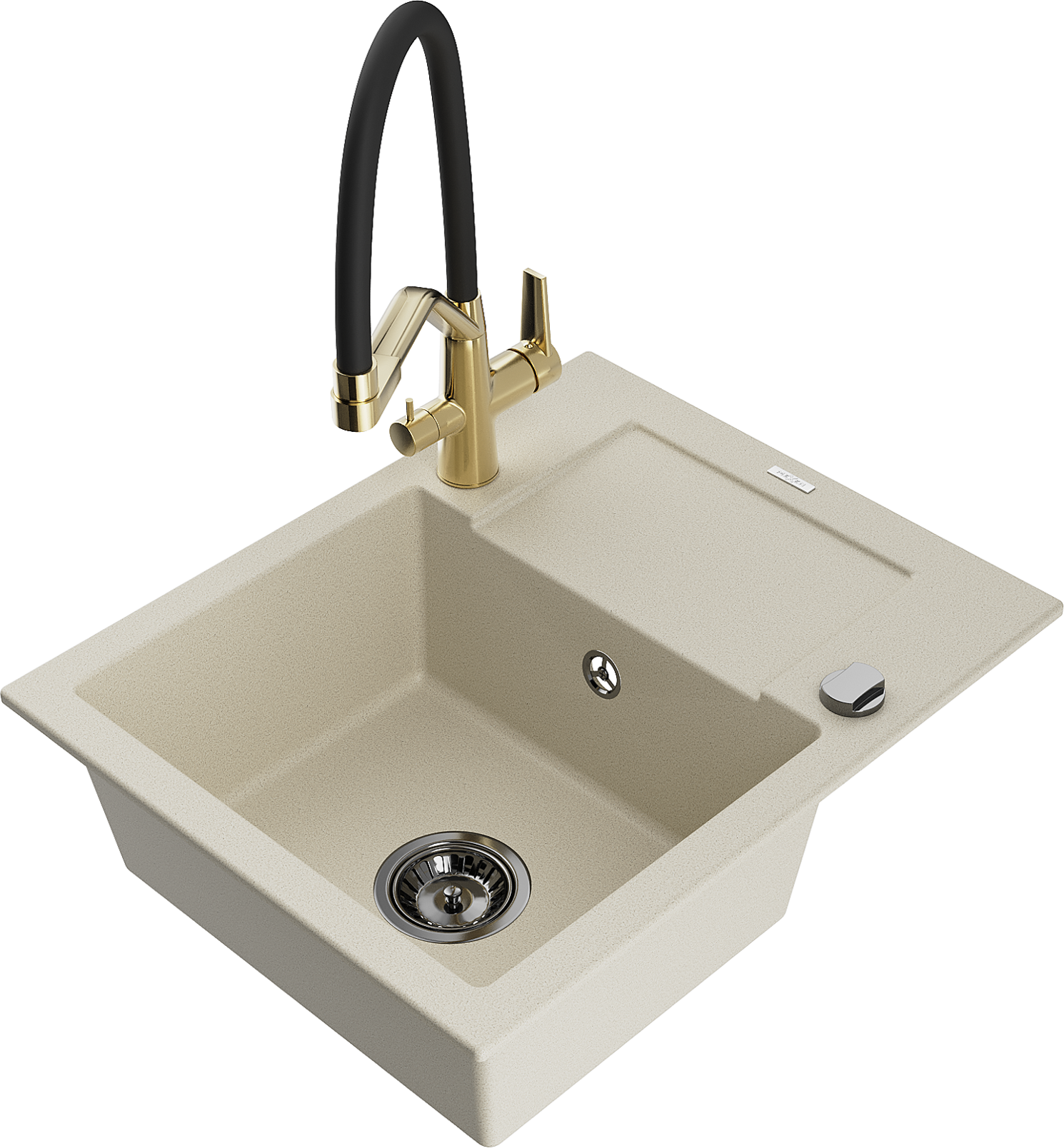 Mexen Enzo jednokomorový granitový drez s odkvapkávačom a kuchynskou batériou Duo, béžový - 6506-69-671701-57-B