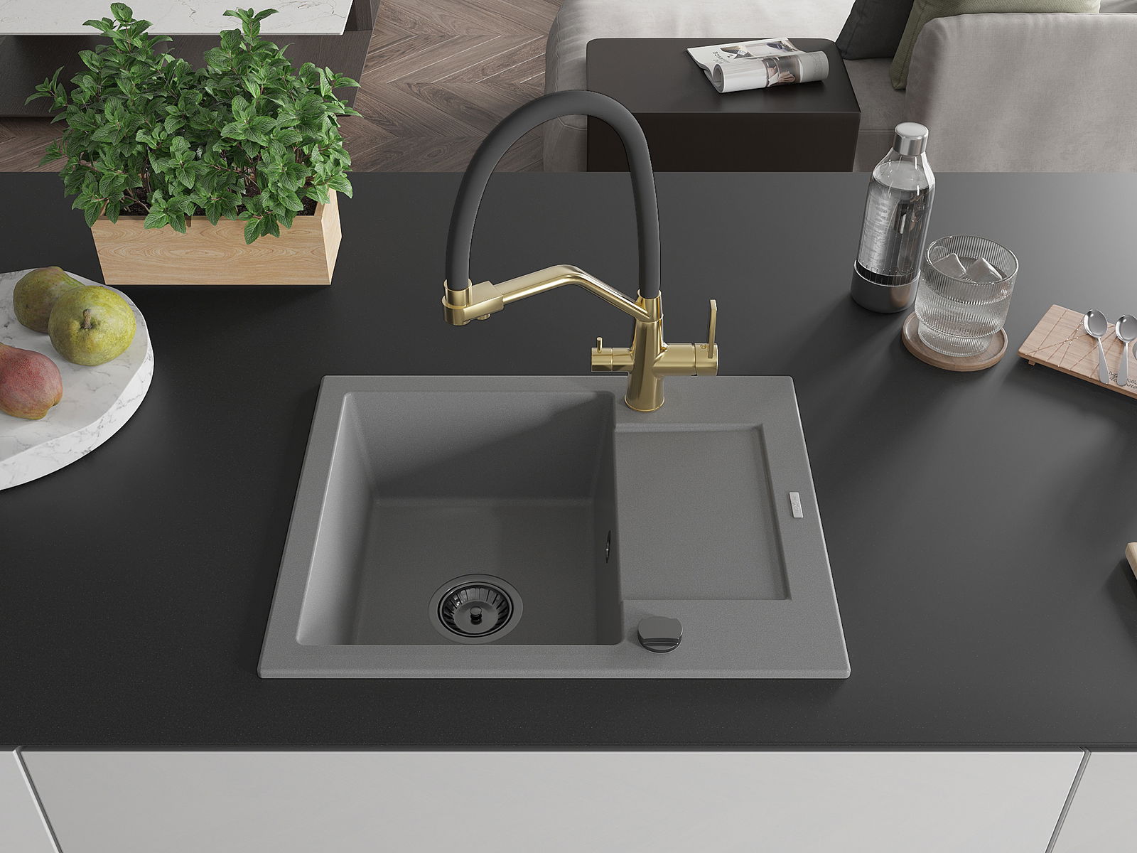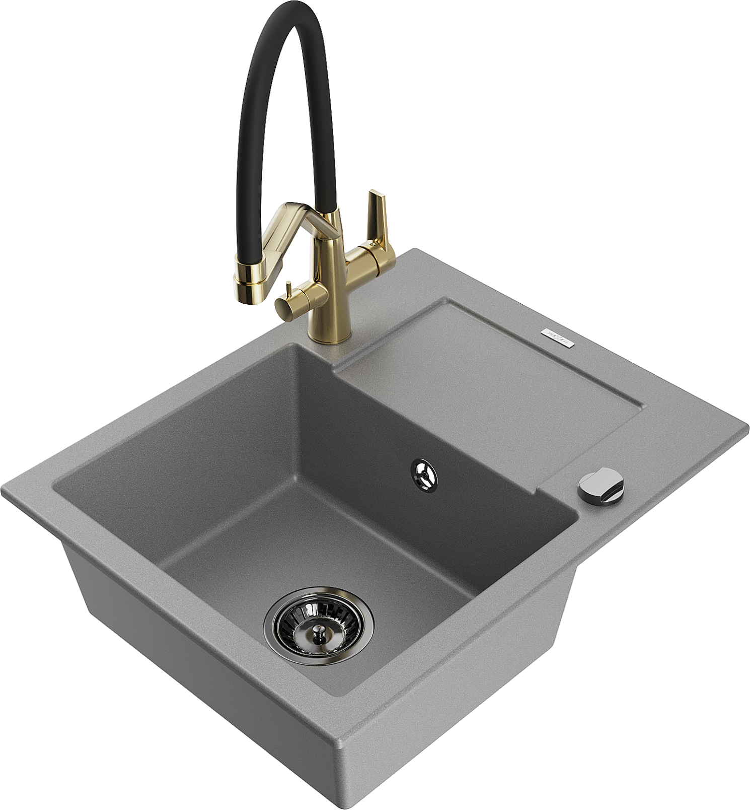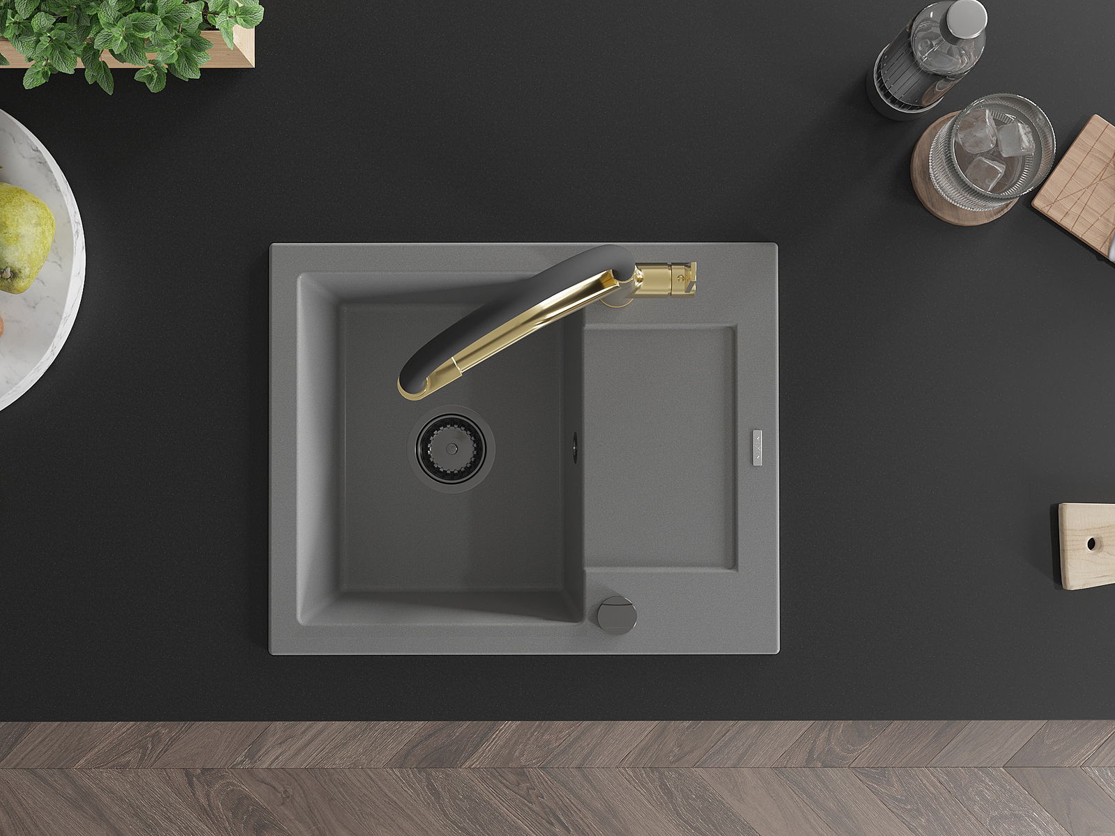 Mexen Enzo žulový drez 1-komorový s odkvapkávacom a kuchynskou batériou Duo, sivý - 6506-71-671701-57-B