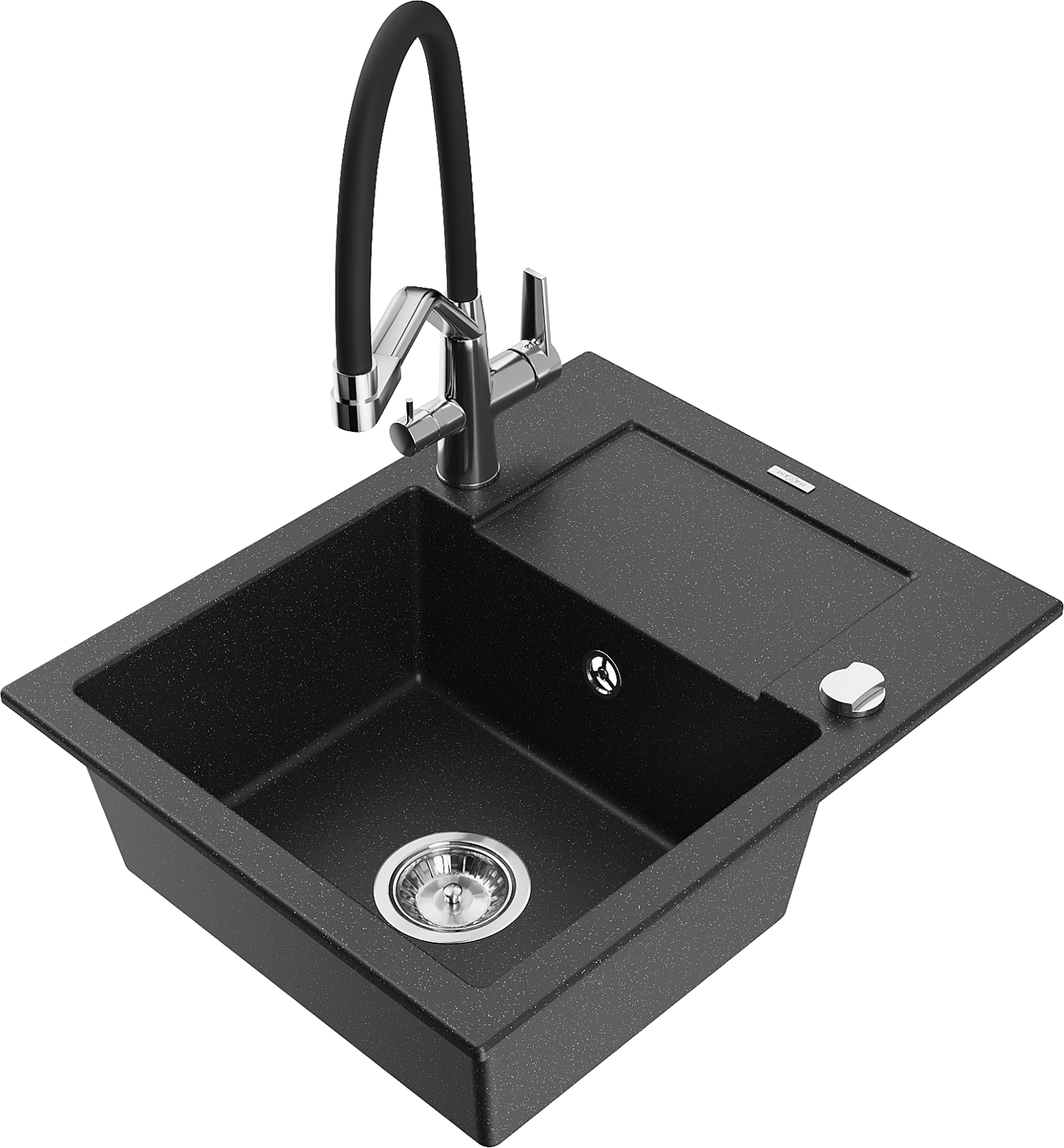 Mexen Enzo granitový kuchynský drez s 1 komorou a odkvapkávačom a kuchynskou batériou Duo, čierny/strieborný metalík - 6506-73-?