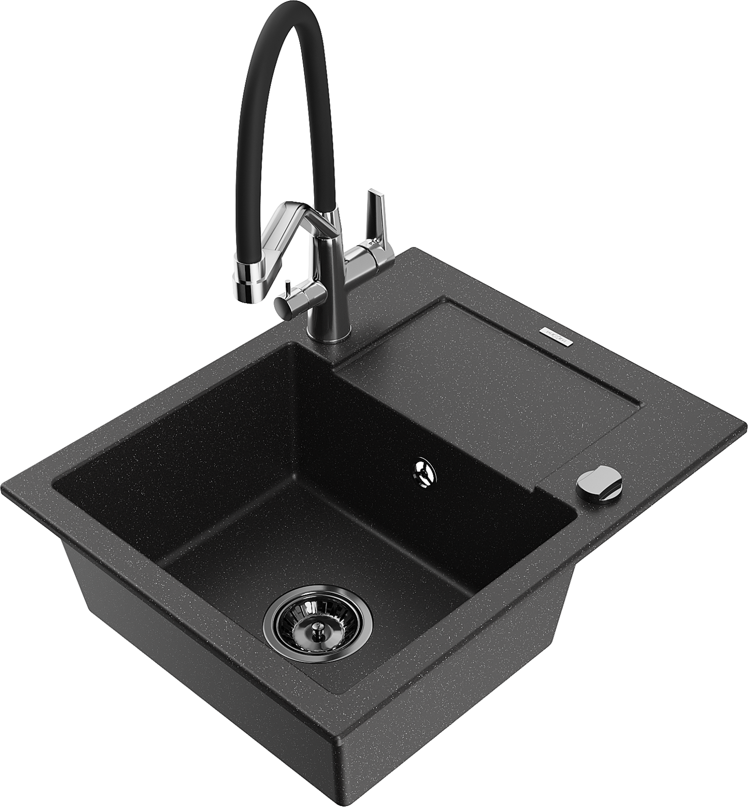 Mexen Enzo jednokomorový žulový drez s odkvapkávačom a kuchynskou batériou Duo, čierny/strieborný metalik - 6506-73-671701-07-B