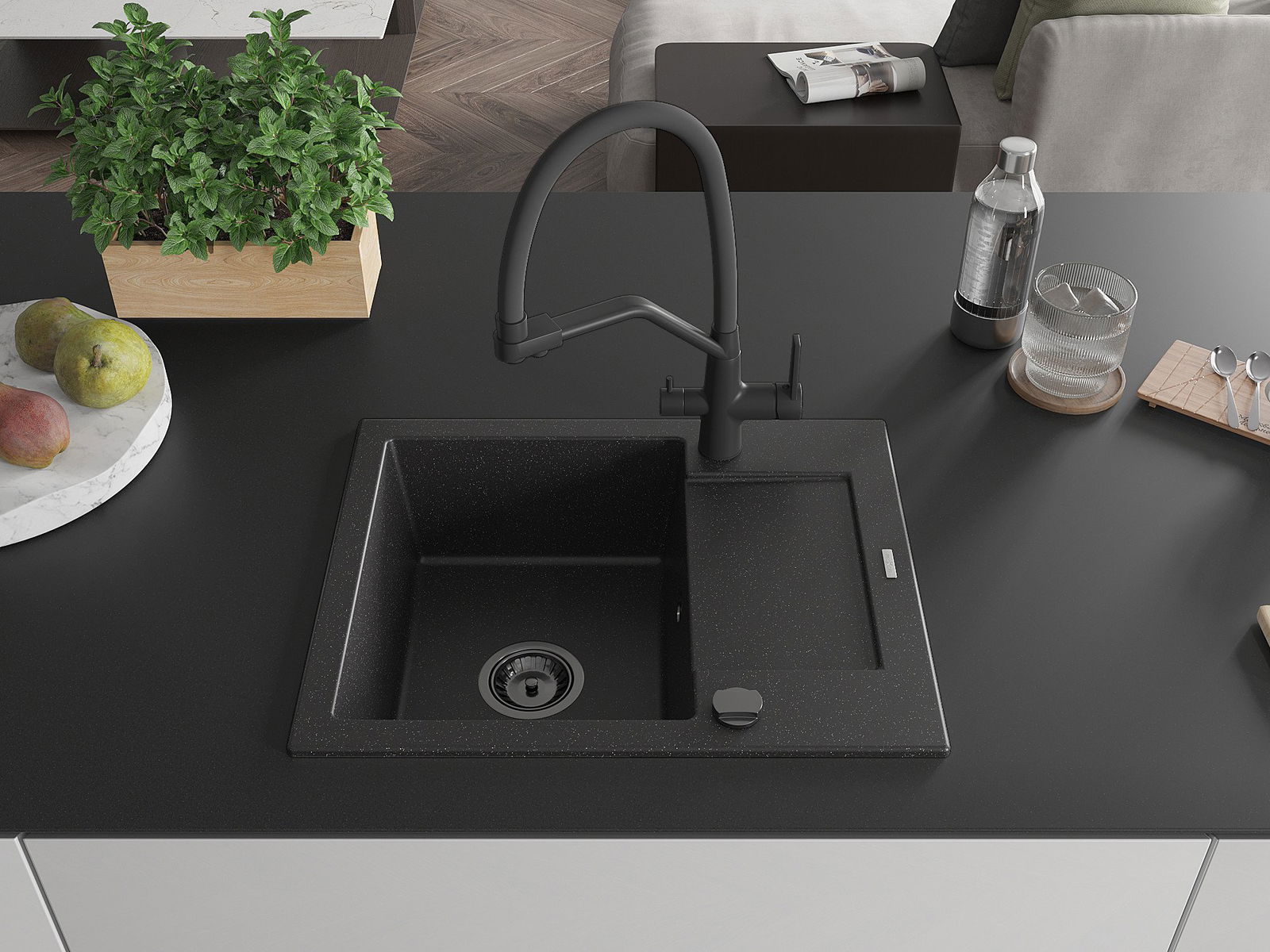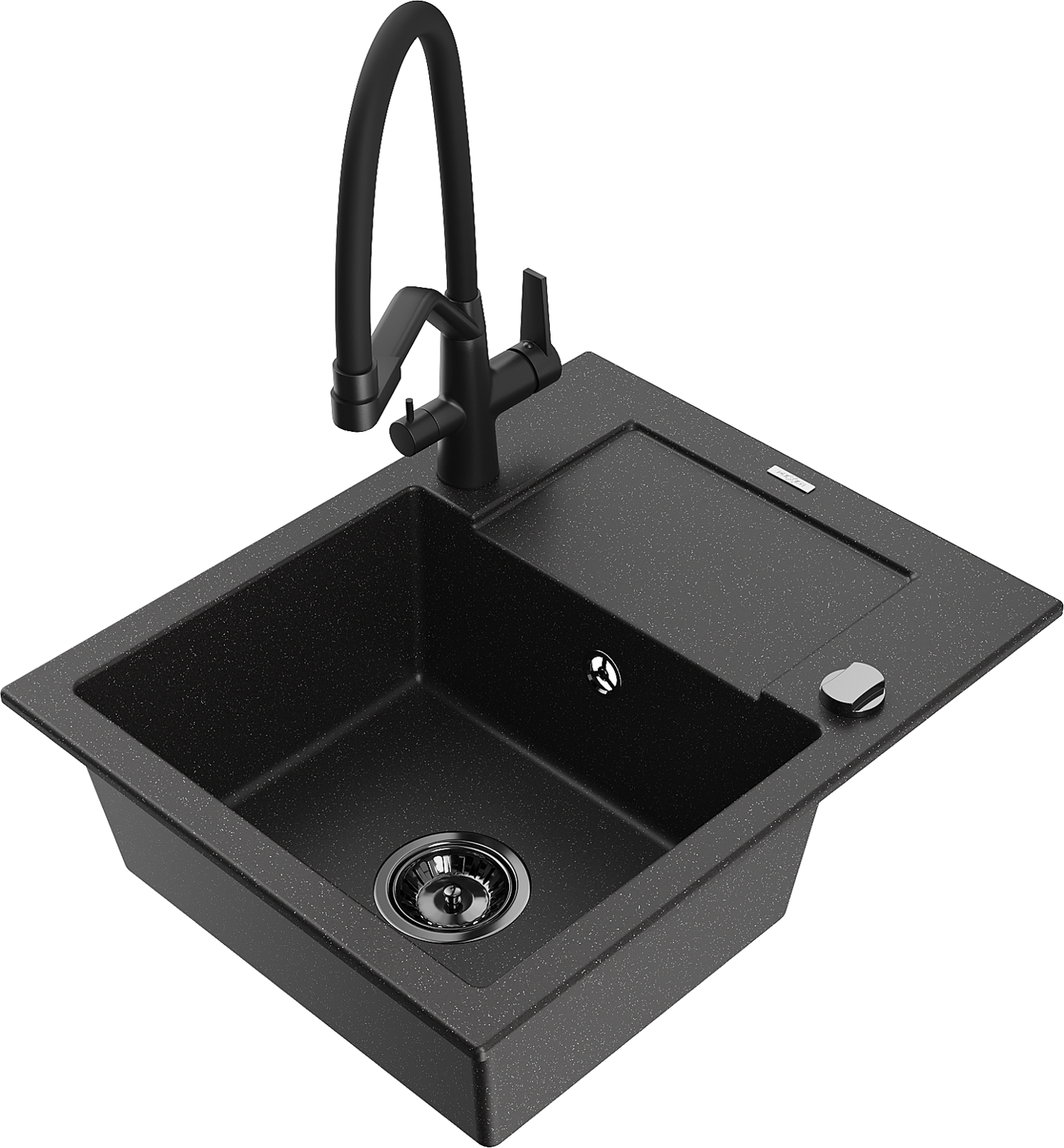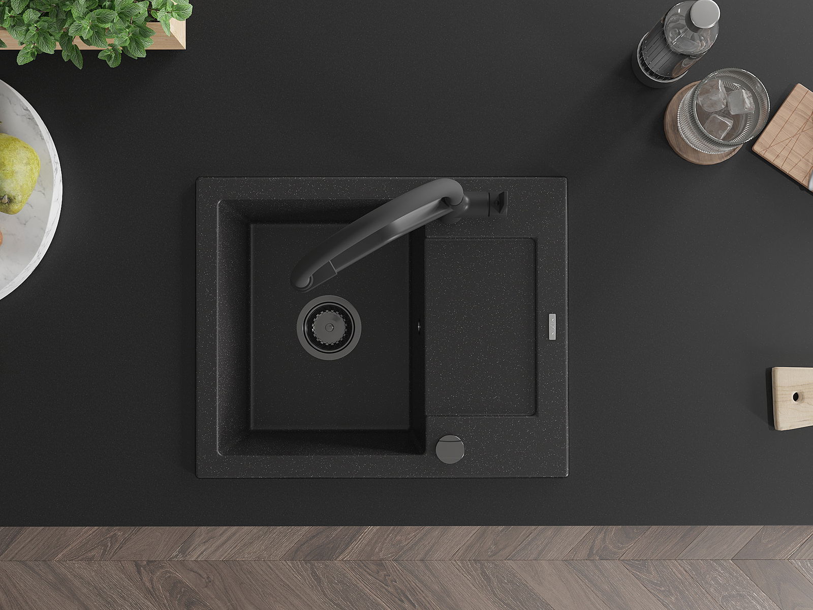 Mexen Enzo granitový drez s jednou komorou s odkvapkávačom a kuchynskou batériou Duo, čierny/strieborný metalik