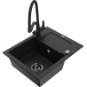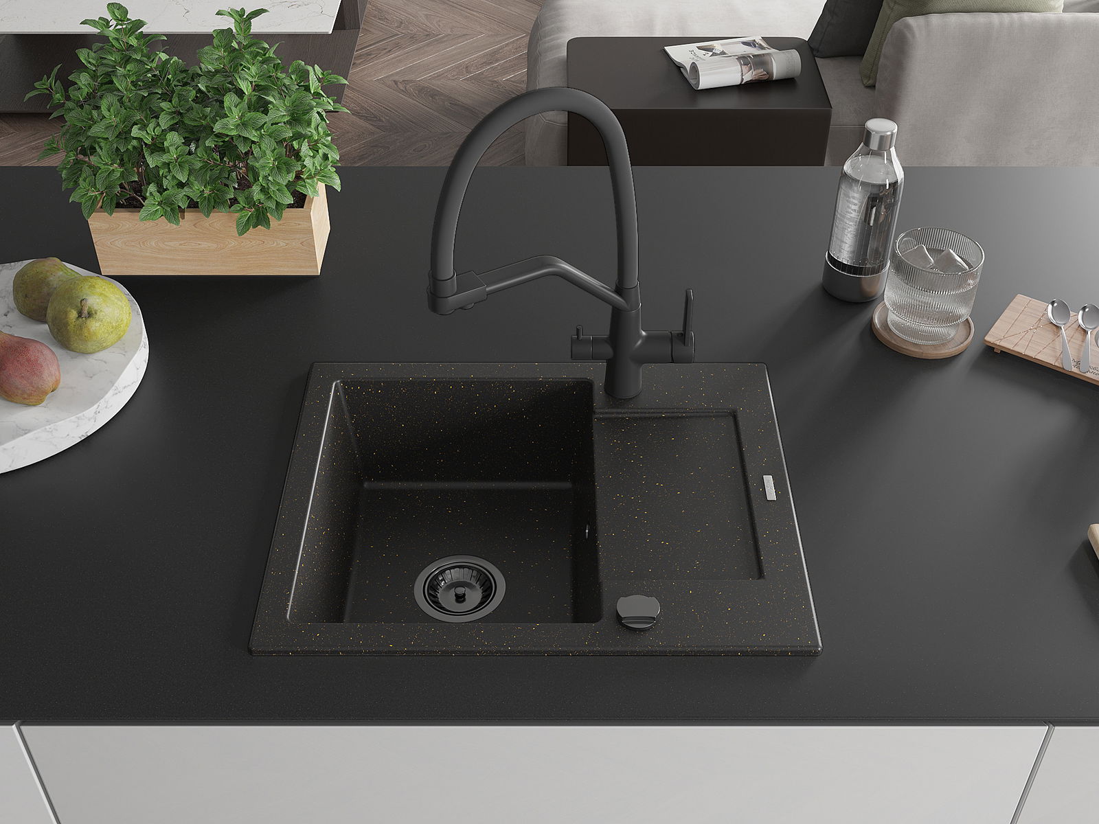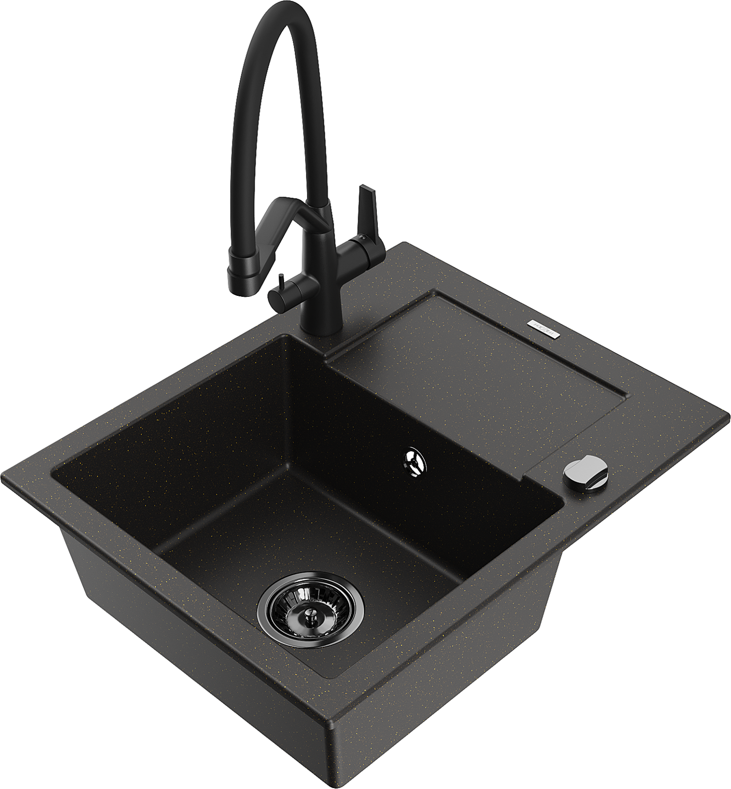 Mexen Enzo žulový drez s jednou komorou s odkvapkávačom a kuchynskou batériou Duo, čierny/zlatý metalik