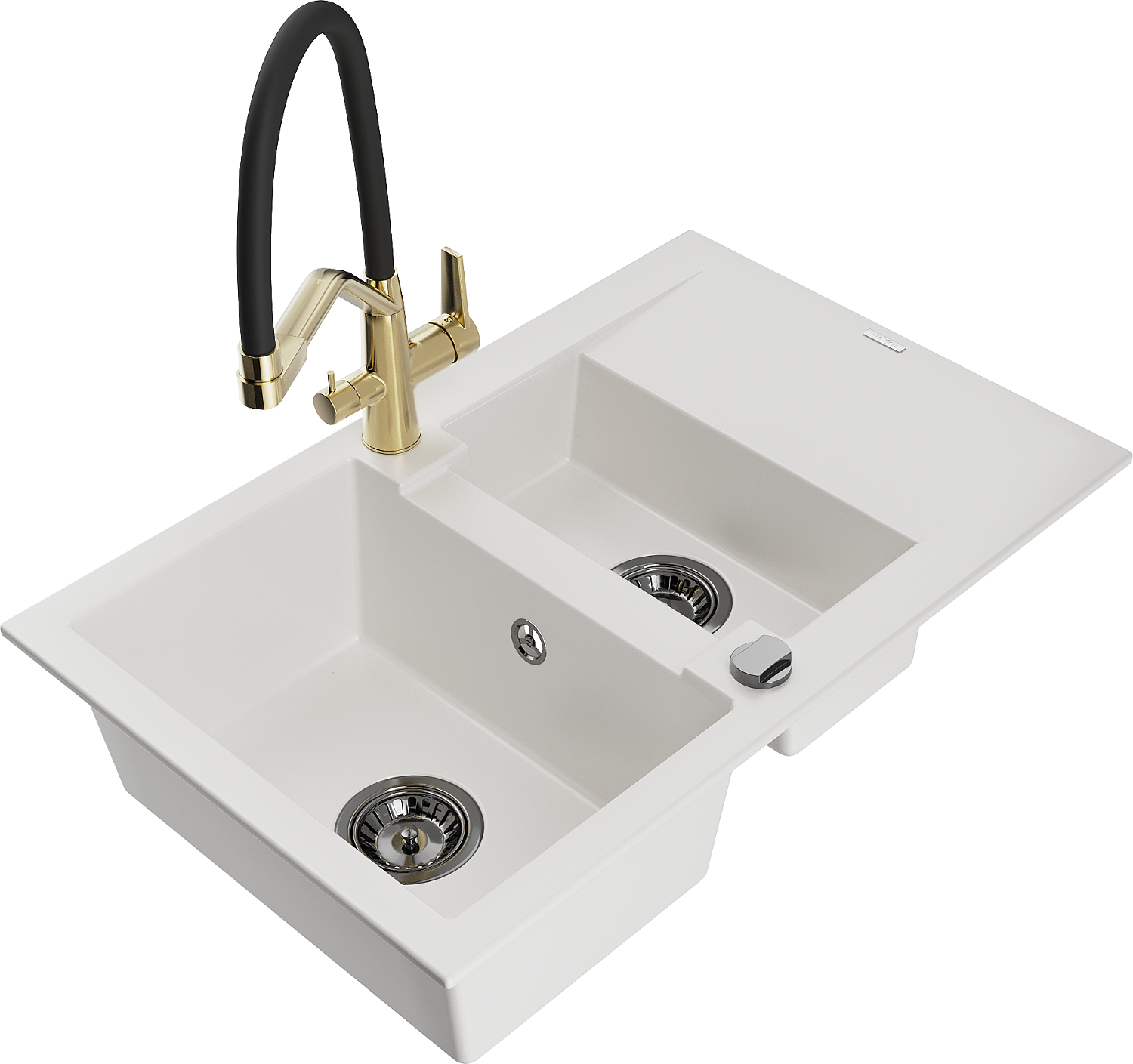 Mexen Gaspar žulový kuchynský drez 1,5-komorový s odkvapkávačom a kuchynskou batériou Duo, biely - 6507-20-671701-57-B