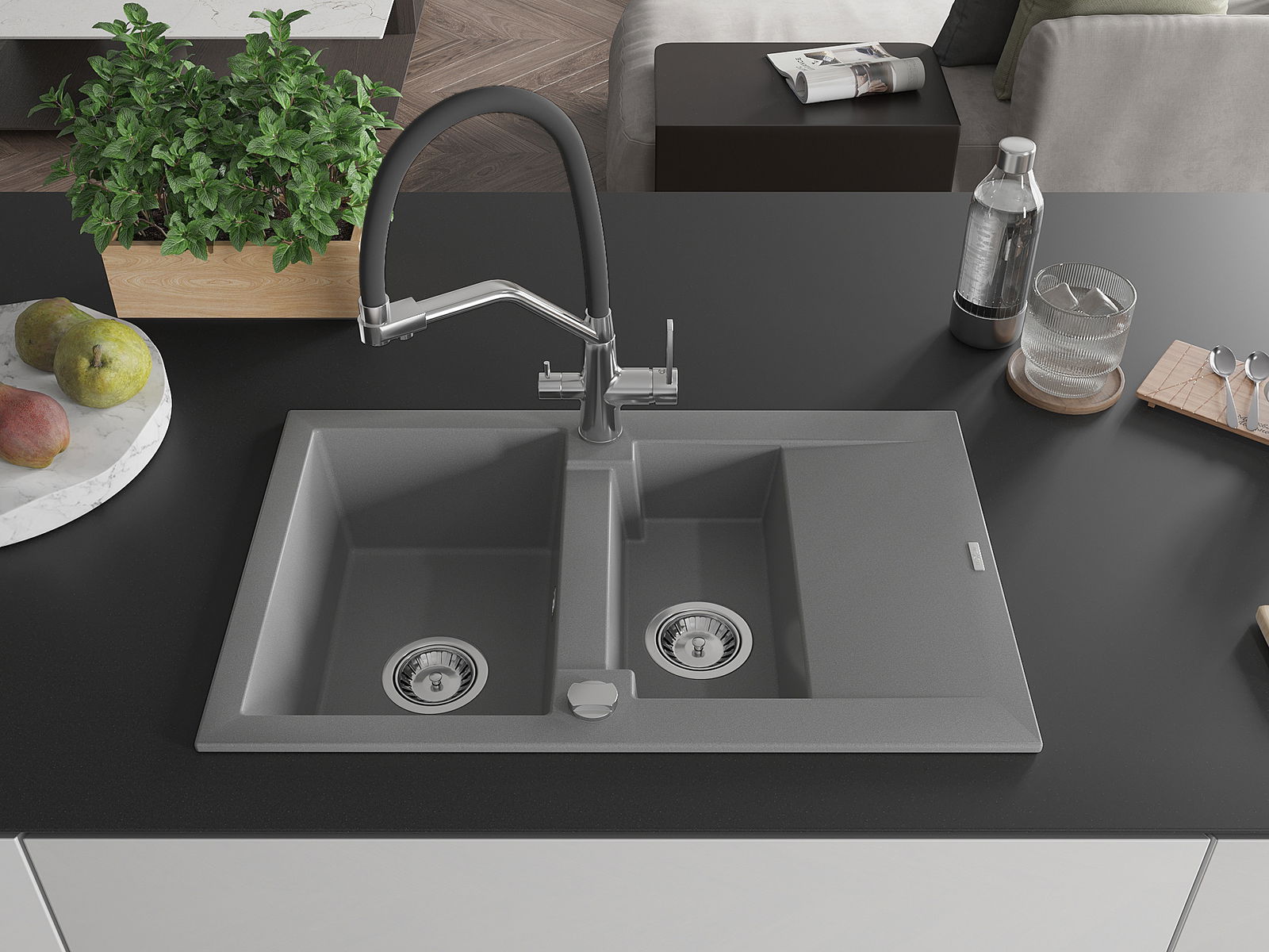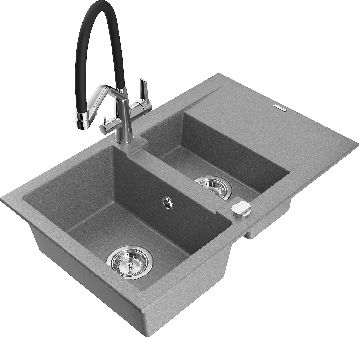 Mexen Gaspar žulový drez 1,5-komorový s odkvapkávacou plochou a kuchynskou batériou Duo, sivý - 6507-71-671701-07