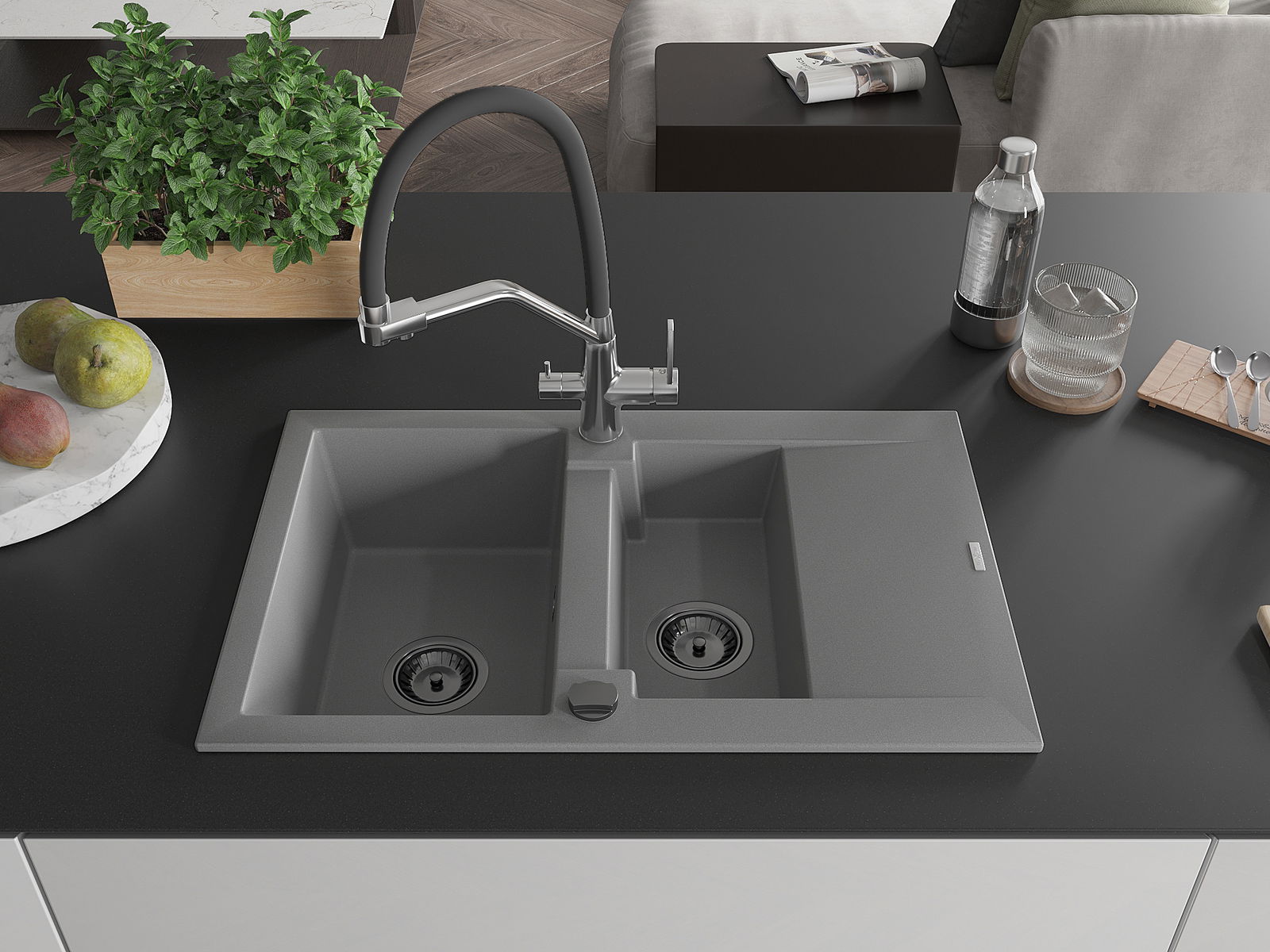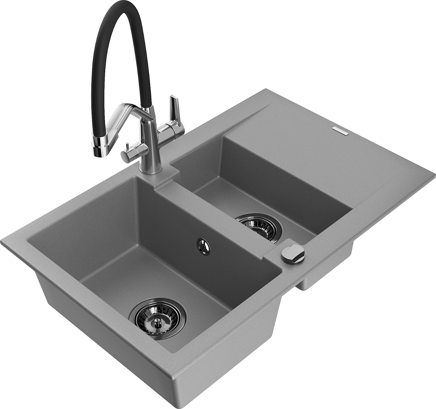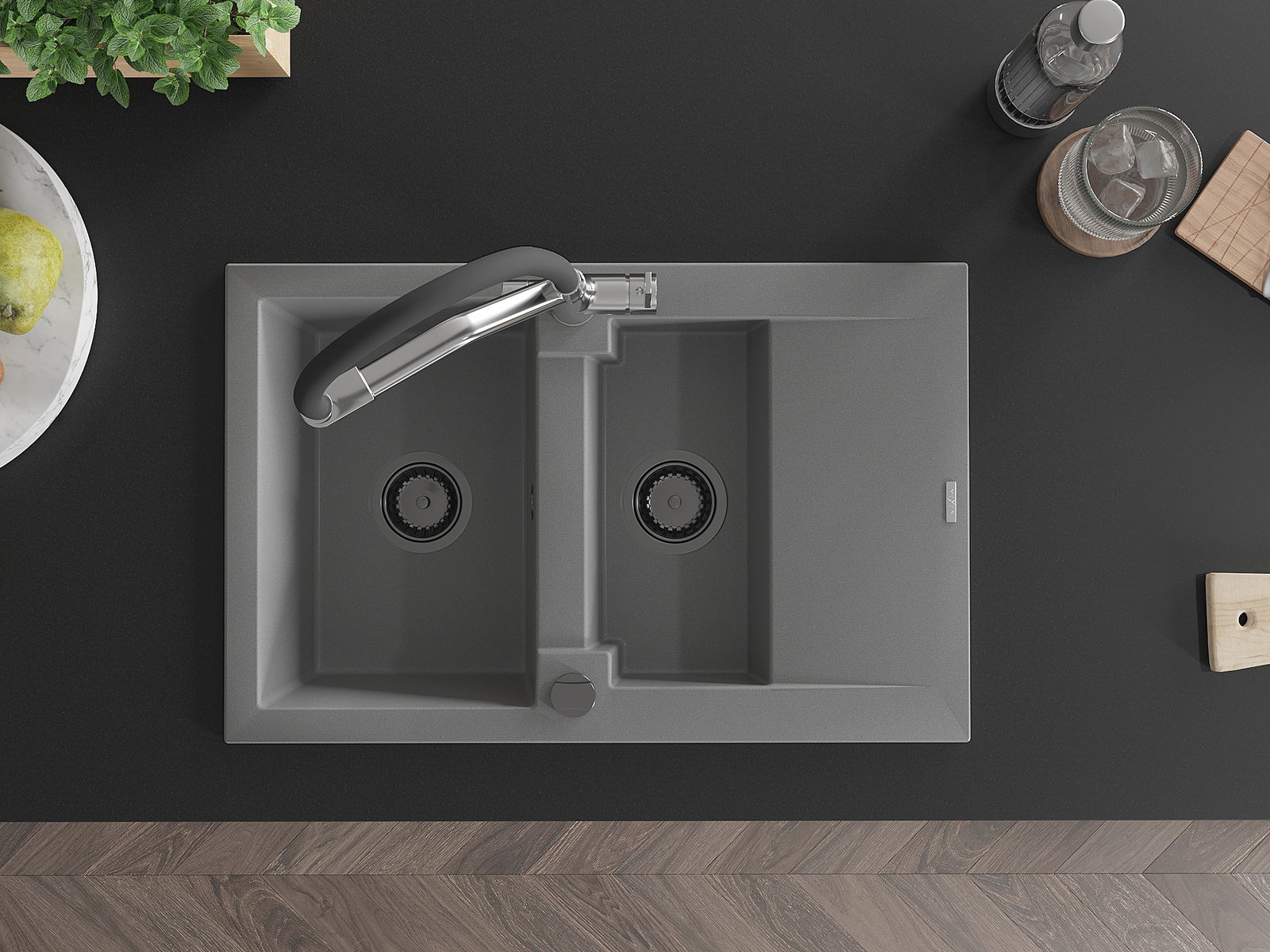 Mexen Gaspar žulový drez s 1,5 komorovou konstrukciou s odkvapkávačom a kuchynskou batériou Duo, sivá - 6507-71-671701-07-B
