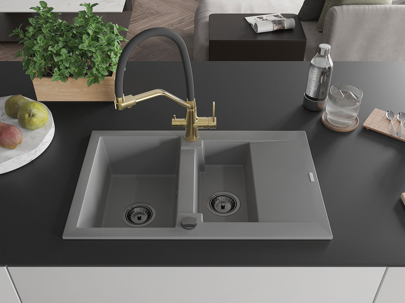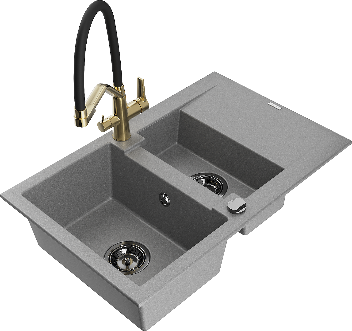 Mexen Gaspar žulový drez 1,5-komorový s odkvapkávačom a kuchynskou batériou Duo, sivý - 6507-71-671701-57-B