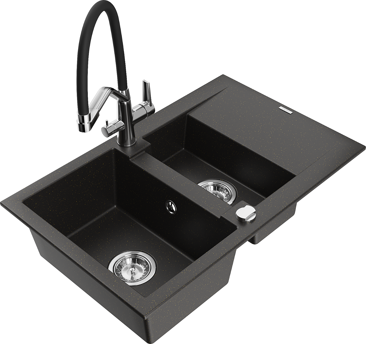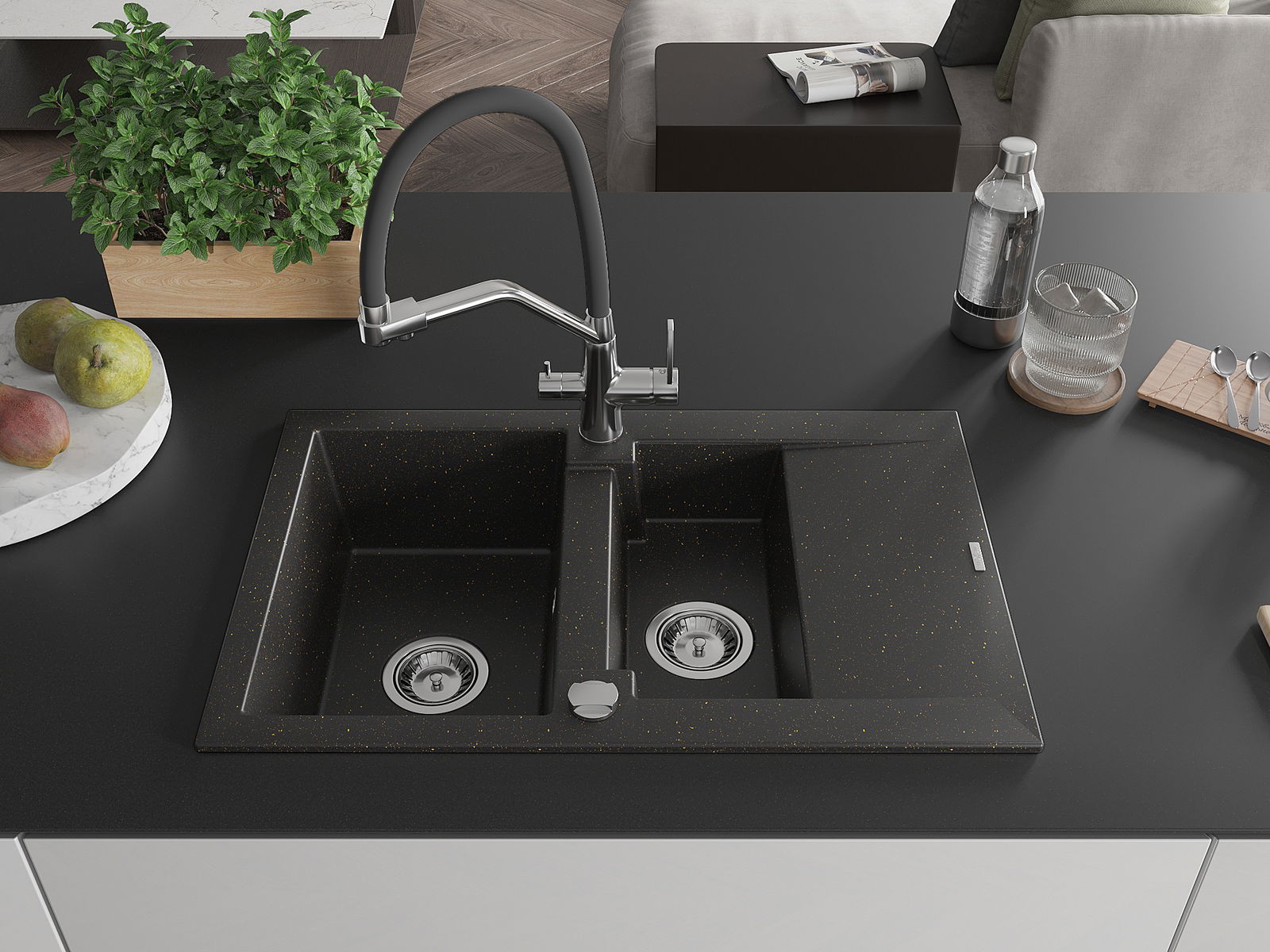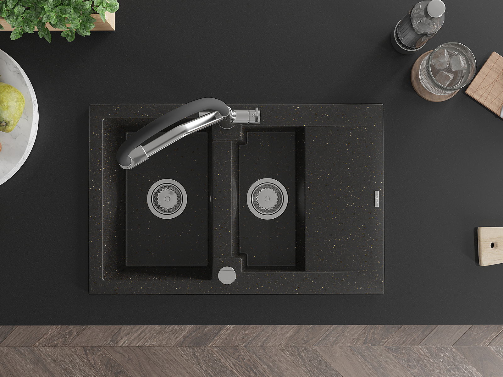 Mexen Gaspar žulový drez s 1,5 komorou s odkvapkávačom a kuchynskou batériou Duo, čierny/zlatý metalik