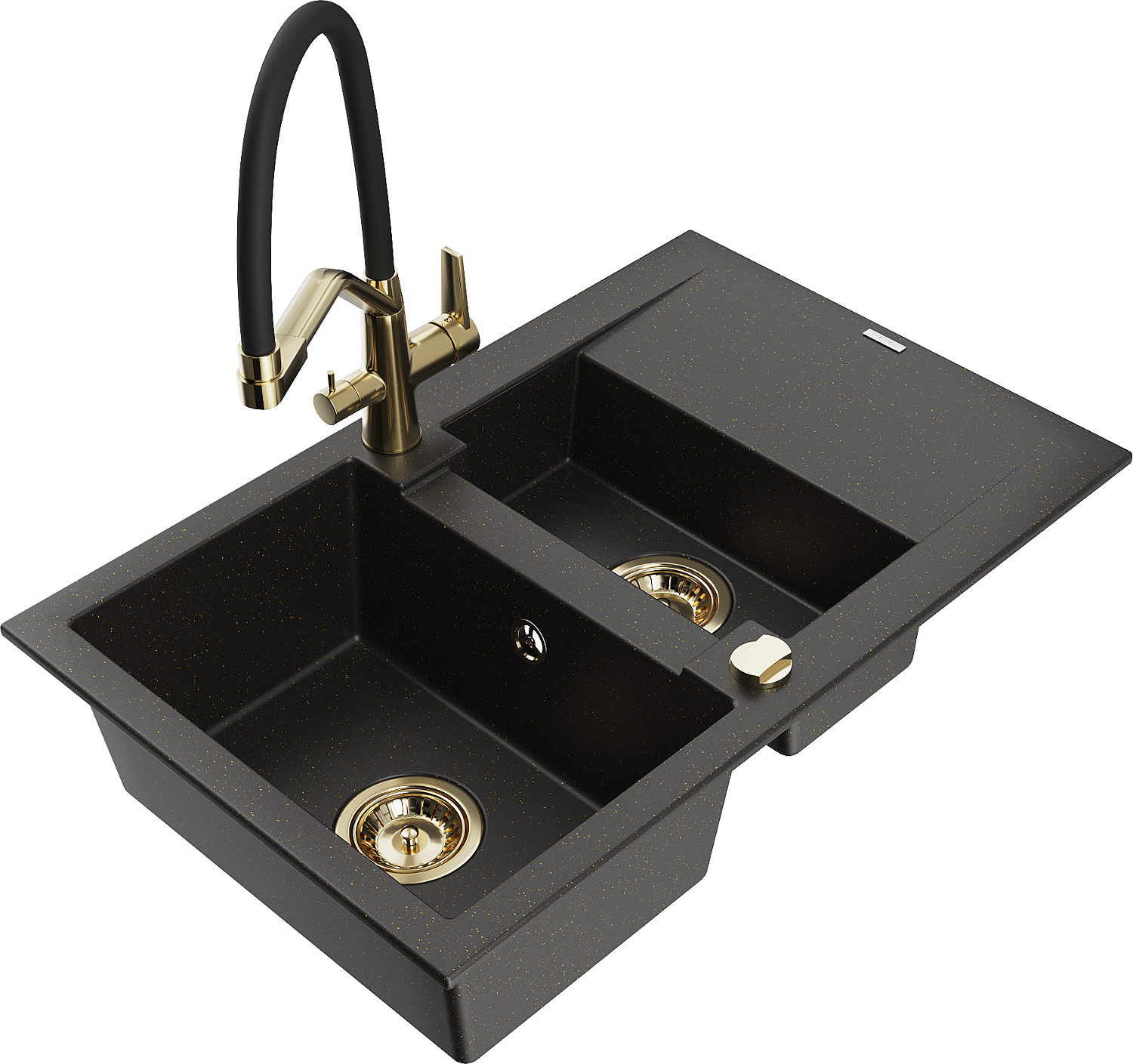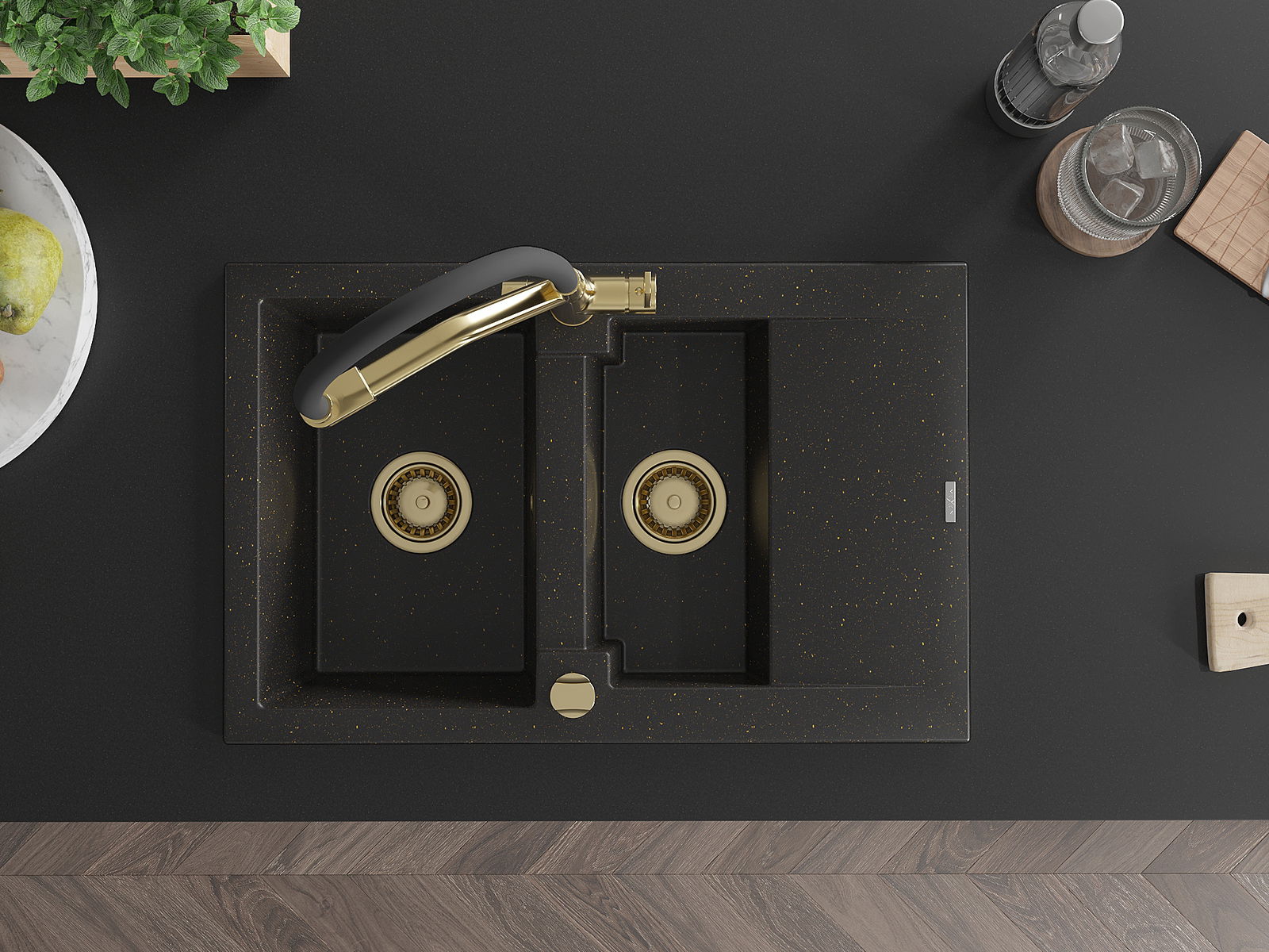 Mexen Gaspar granitový drez 1,5-komorový s odkvapkávačom a kuchynskou batériou Duo, čierny/zlatý metalik - 6507-75-671701-57-G