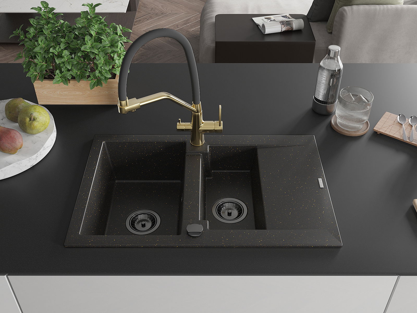 Mexen Gaspar granitový drez 1,5-komorový s odkvapkávačom a kuchynskou batériou Duo, čierno/zlatý metalik - 6507-75-671701-57-B