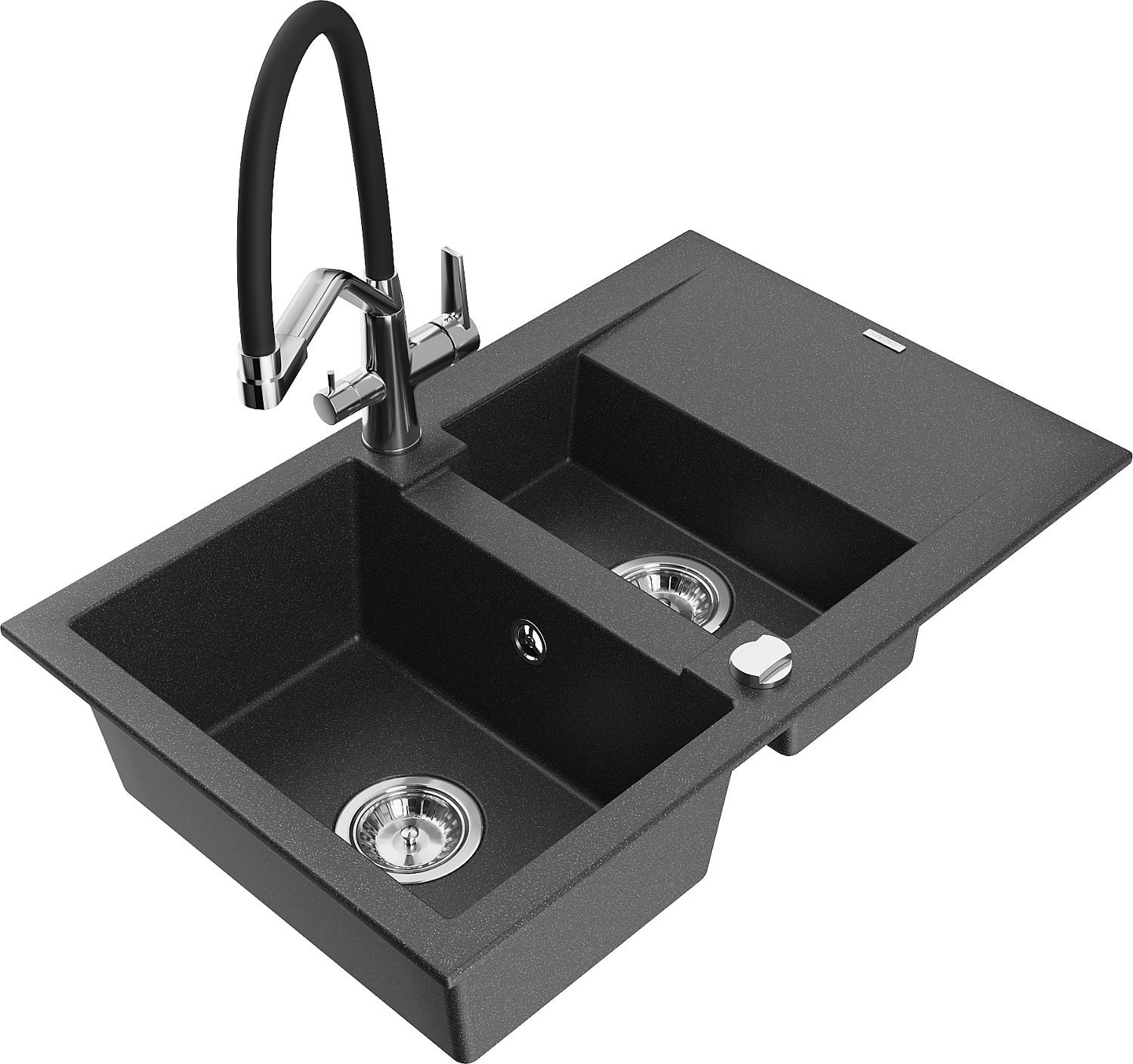 Mexen Gaspar granitový drez 1,5-komorový s odkvapkávačom a kuchynskou batériou Duo, čierny škvrnitý - 6507-76-671701-07