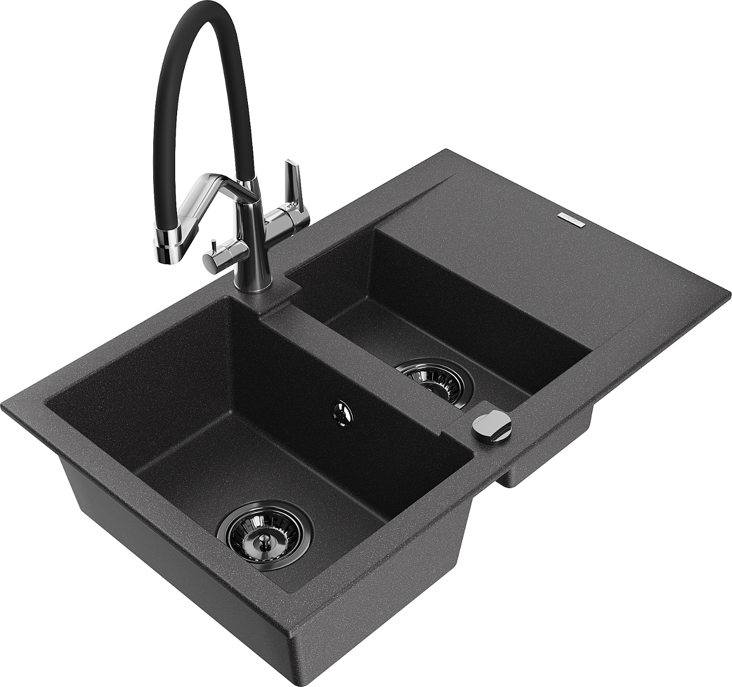 Mexen Gaspar žulový drez 1,5-komorový s odkvapkávačom a kuchynskou batériou Duo, čierny bodkovaný - 6507-76-671701-07-B