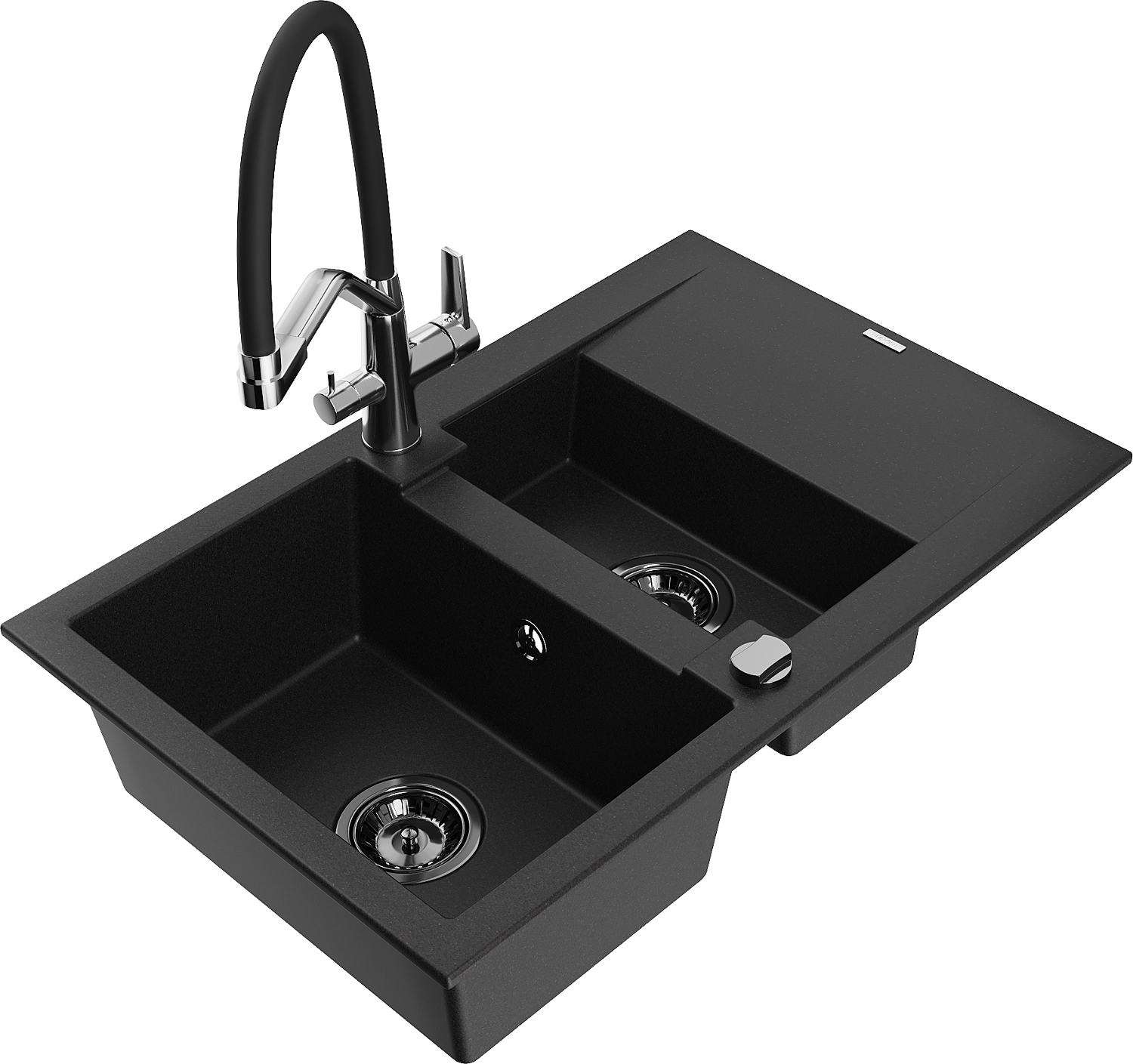 Mexen Gaspar žulový drez 1,5-komorový s odkvapkávacou plochou a kuchynskou batériou Duo, čierny - 6507-77-671701-07-B