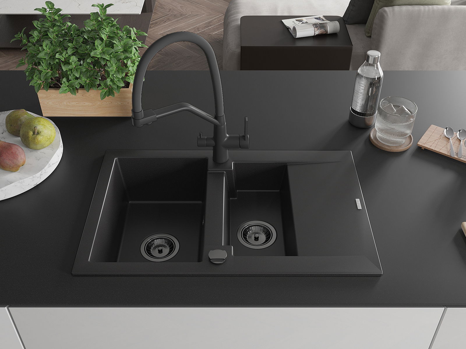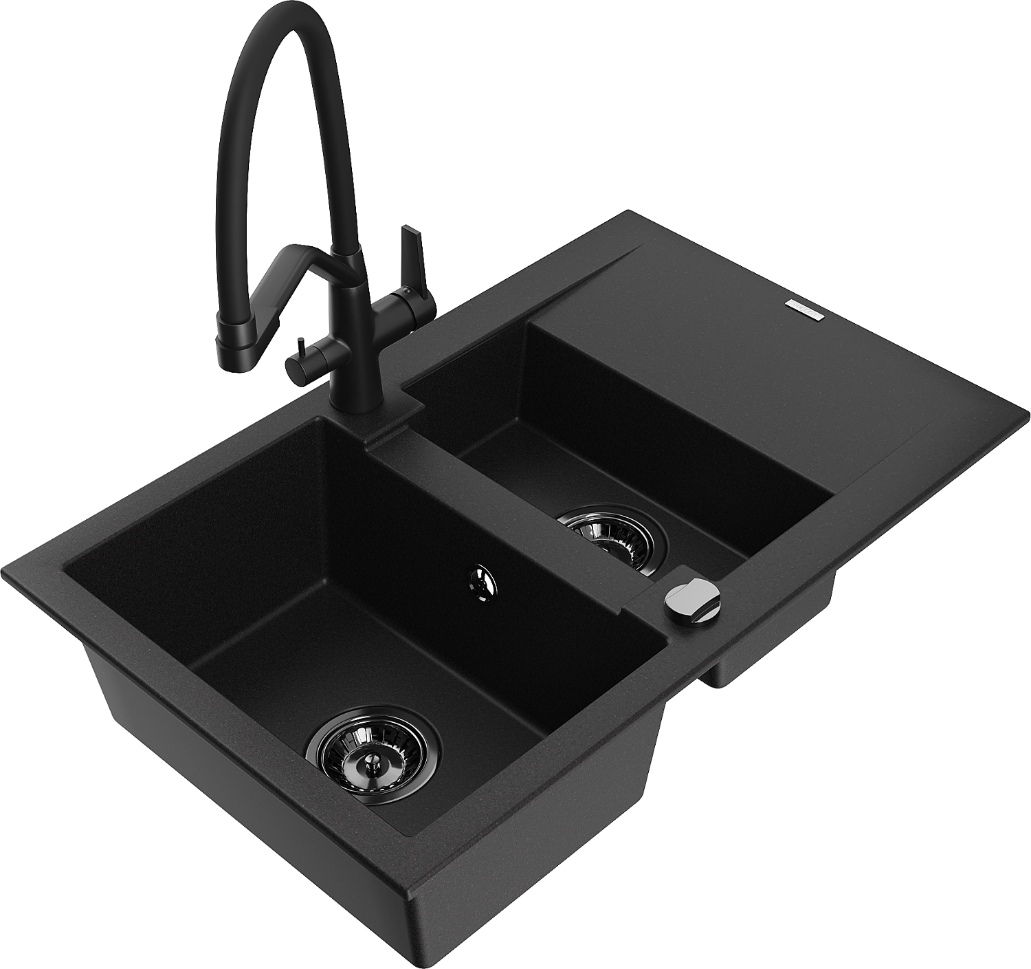 Mexen Gaspar granitový drez 1,5-komorový s odkvapkávačom a kuchynskou batériou Duo, čierny - 6507-77-671701-70-B