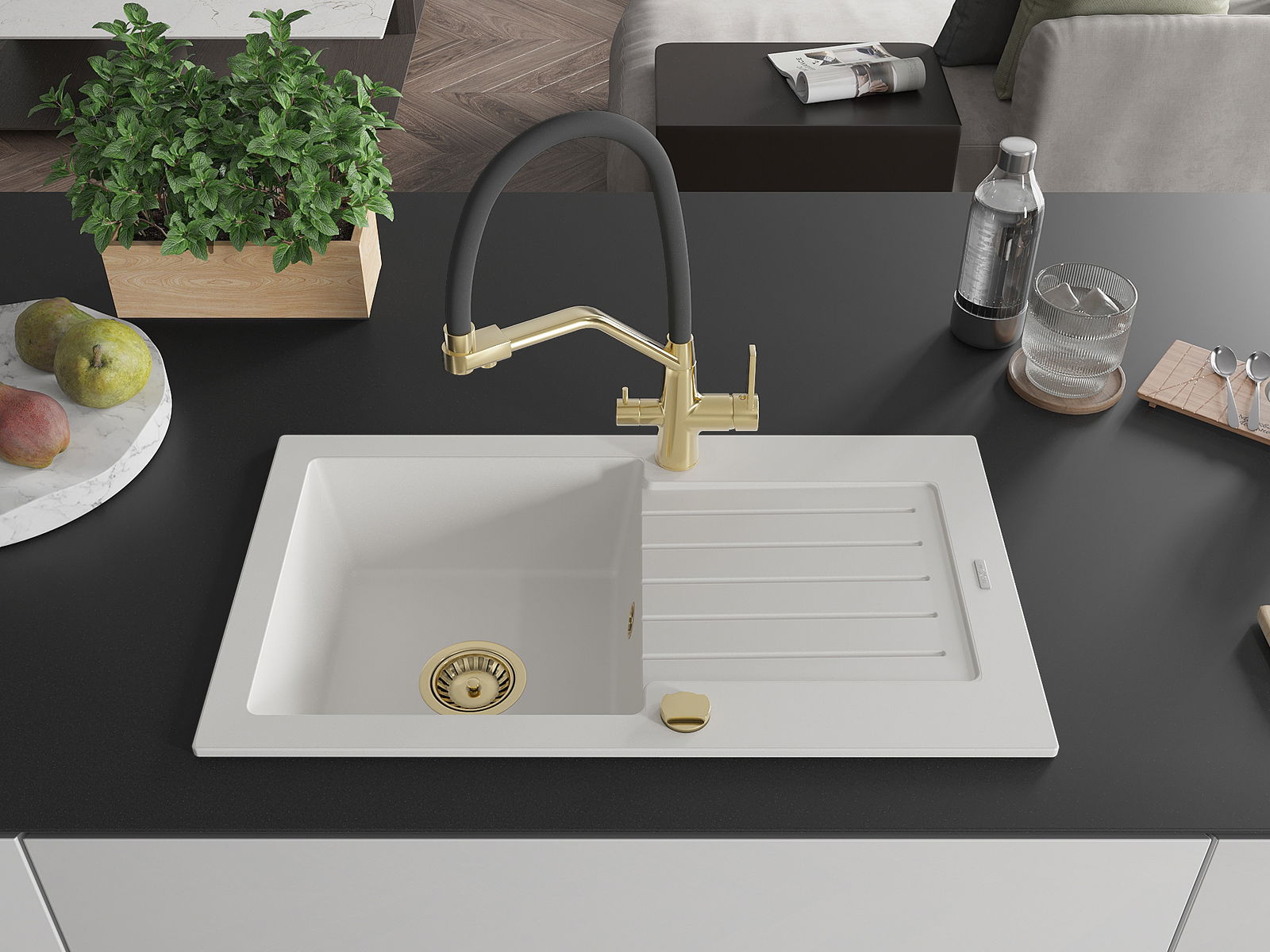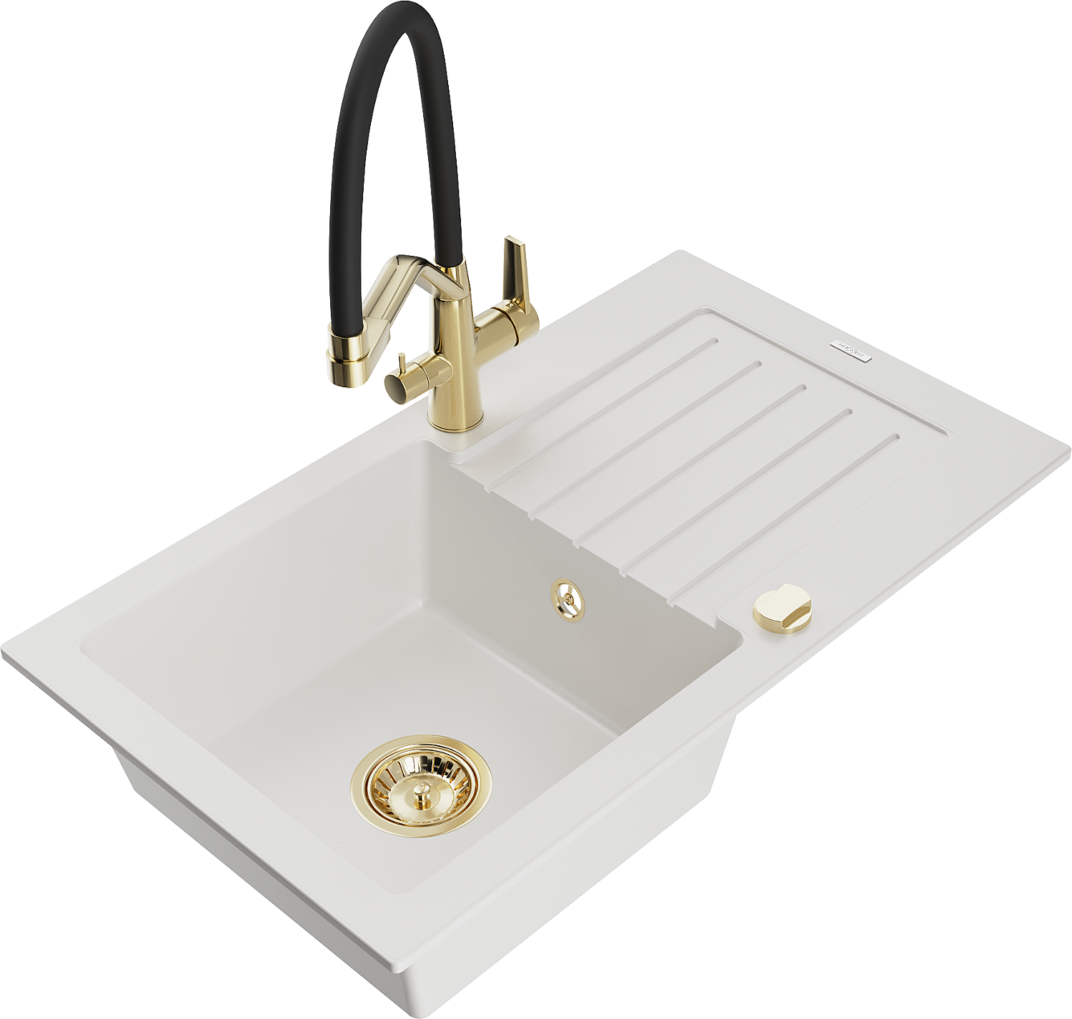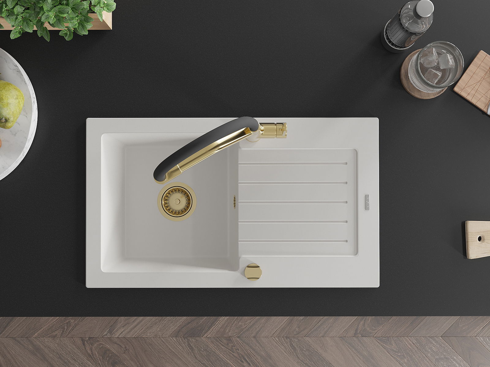 Mexen Pablo žulový drez s odkvapkávacou doskou a kuchynskou batériou Duo, biely - 6510-20-671701-57-G