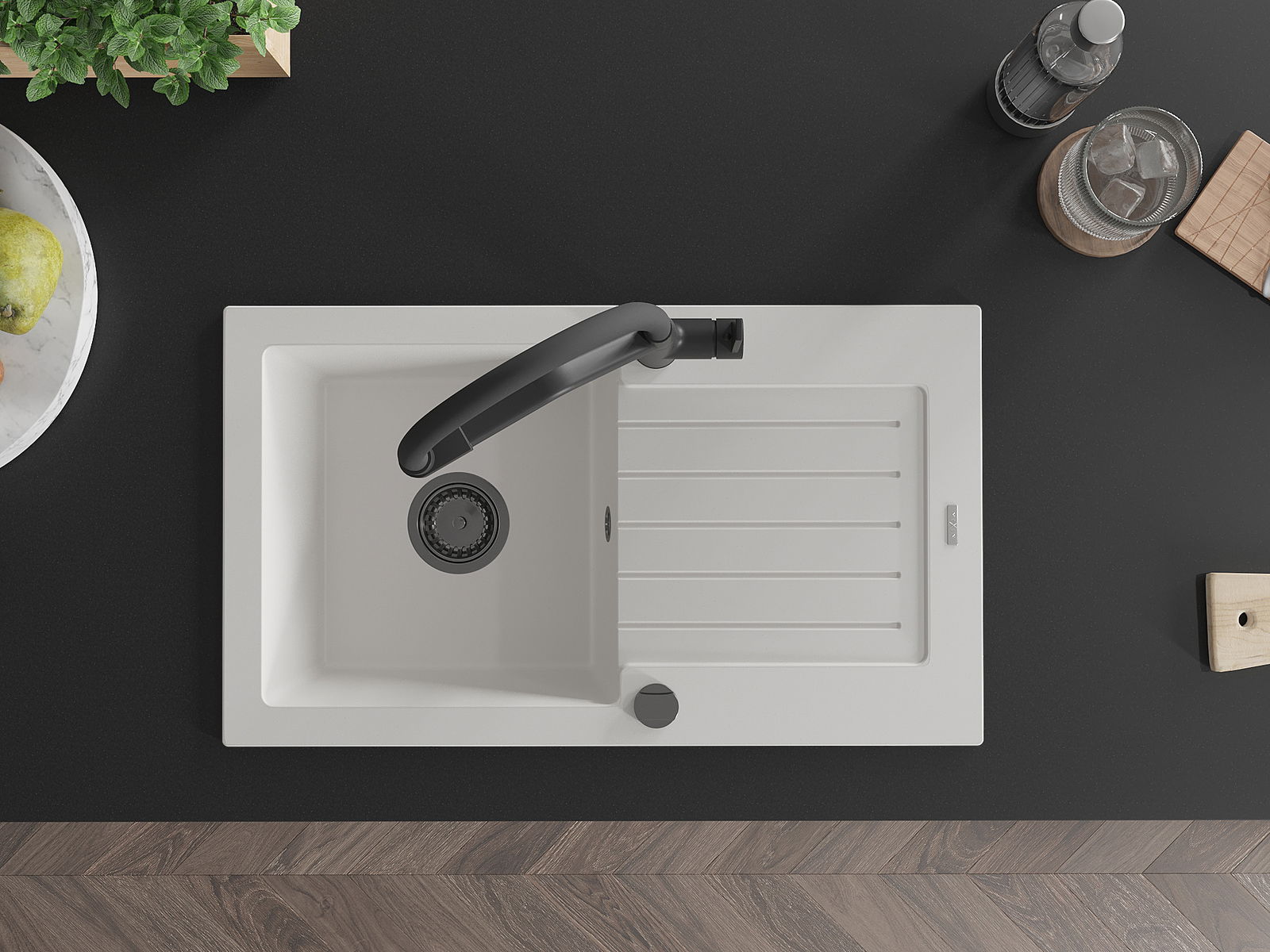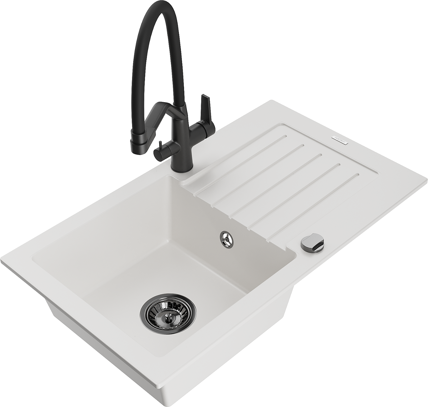 Mexen Pablo granitový drez 1-komorový s odkvapom a kuchynskou batériou Duo, biely - 6510-20-671701-70-B