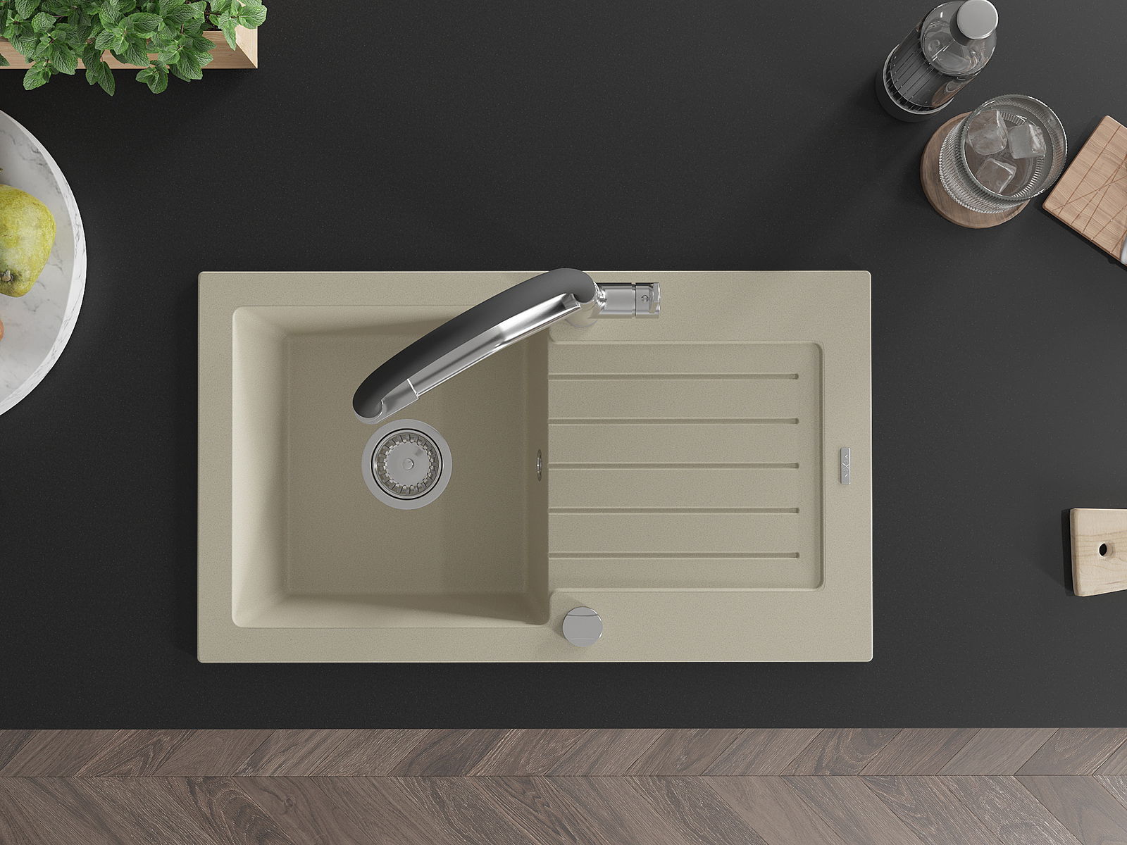 Mexen Pablo jednokomorový žulový drez s odkvapkávačom a kuchynskou batériou Duo, béžový - 6510-69-671701-07