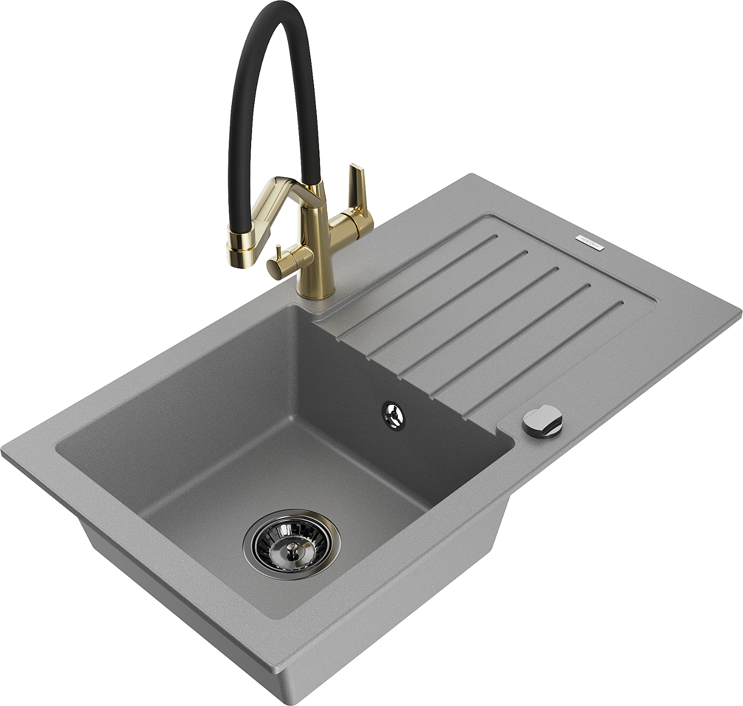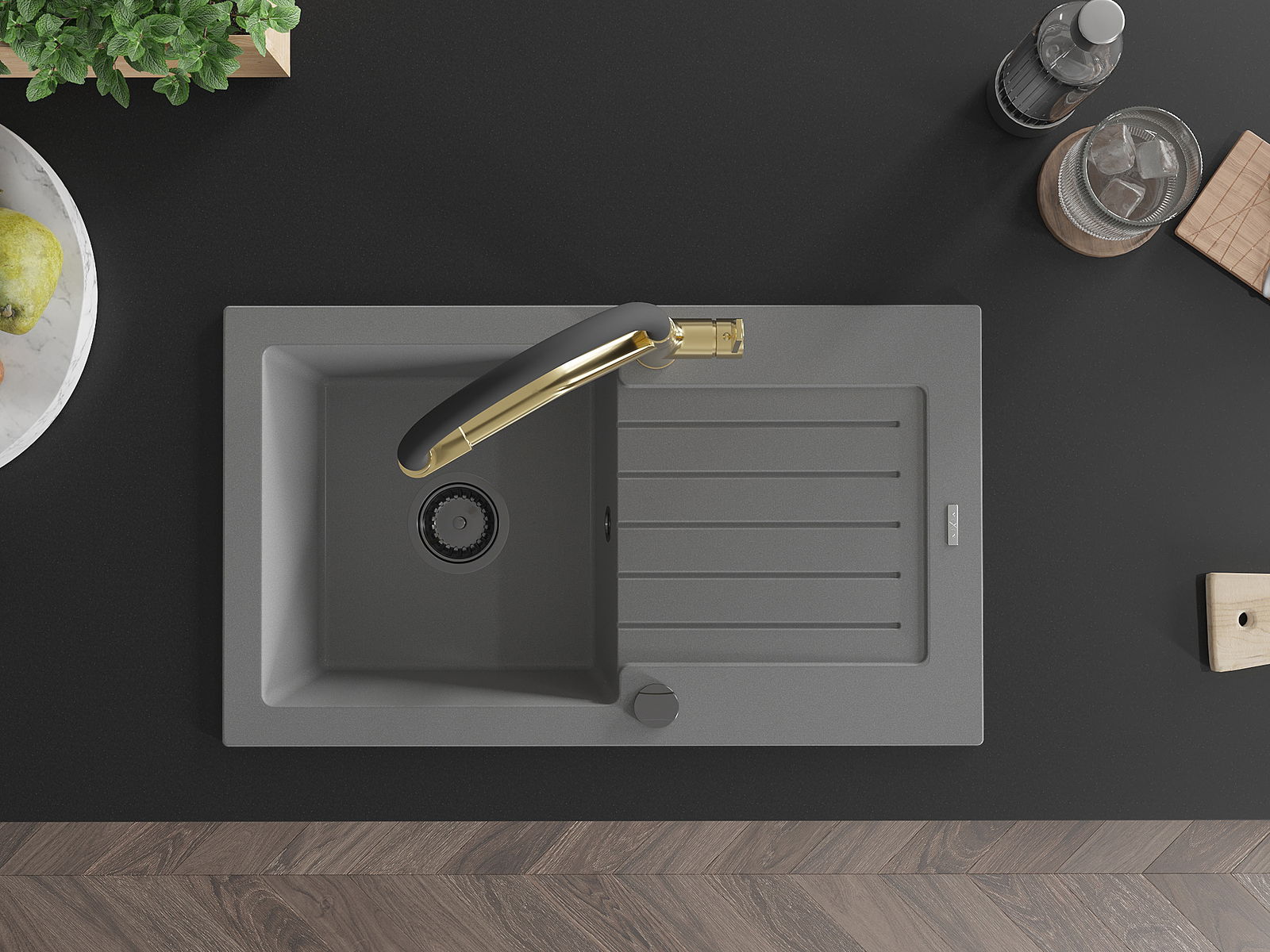 Mexen Pablo žulový drez s 1 komorou s odkvapkávačom a kuchynskou batériou Duo, sivý - 6510-71-671701-57-B