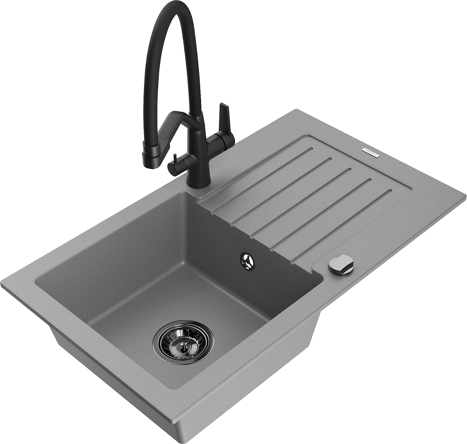Mexen Pablo žulový drez 1-komorový s odkvapkávačom a kuchynskou batériou Duo, sivý - 6510-71-671701-70-B