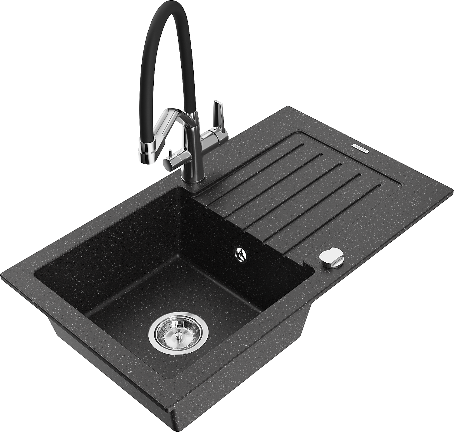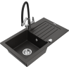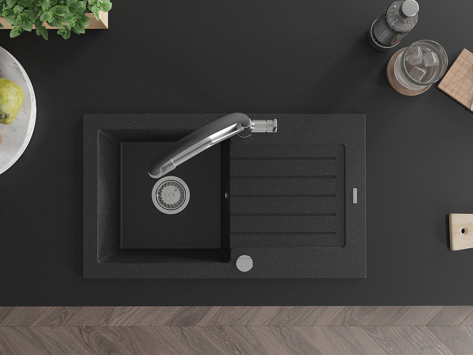 Mexen Pablo granitový drez s 1 komorou, odkvapkávačom a kuchynskou batériou Duo, čierny/strieborný metalický