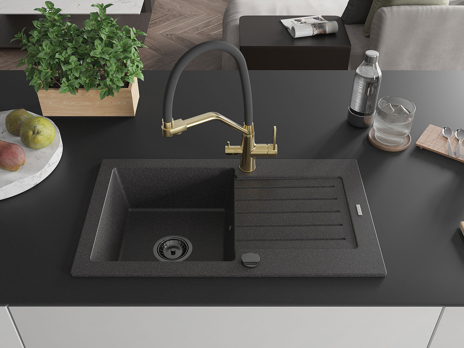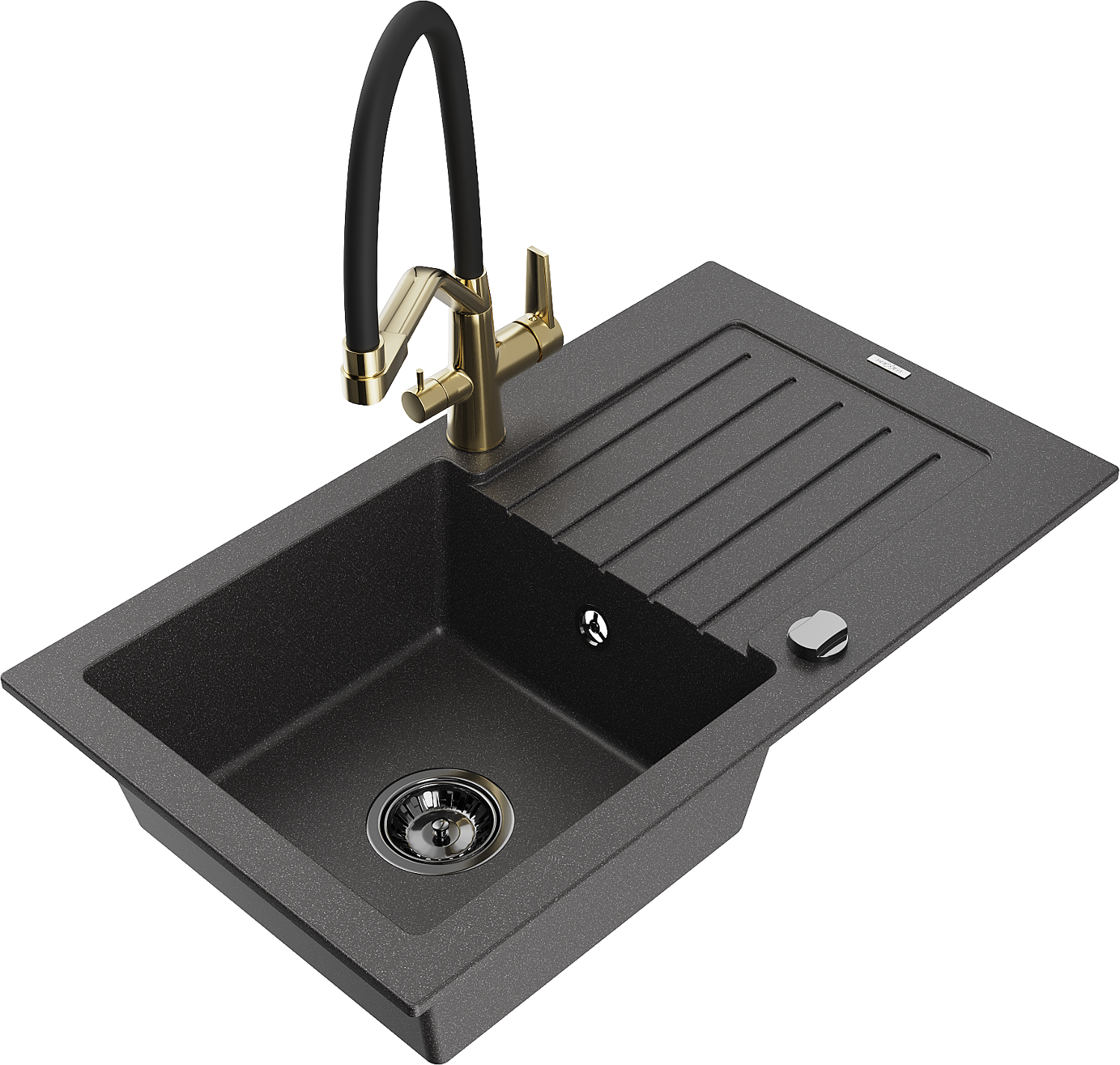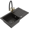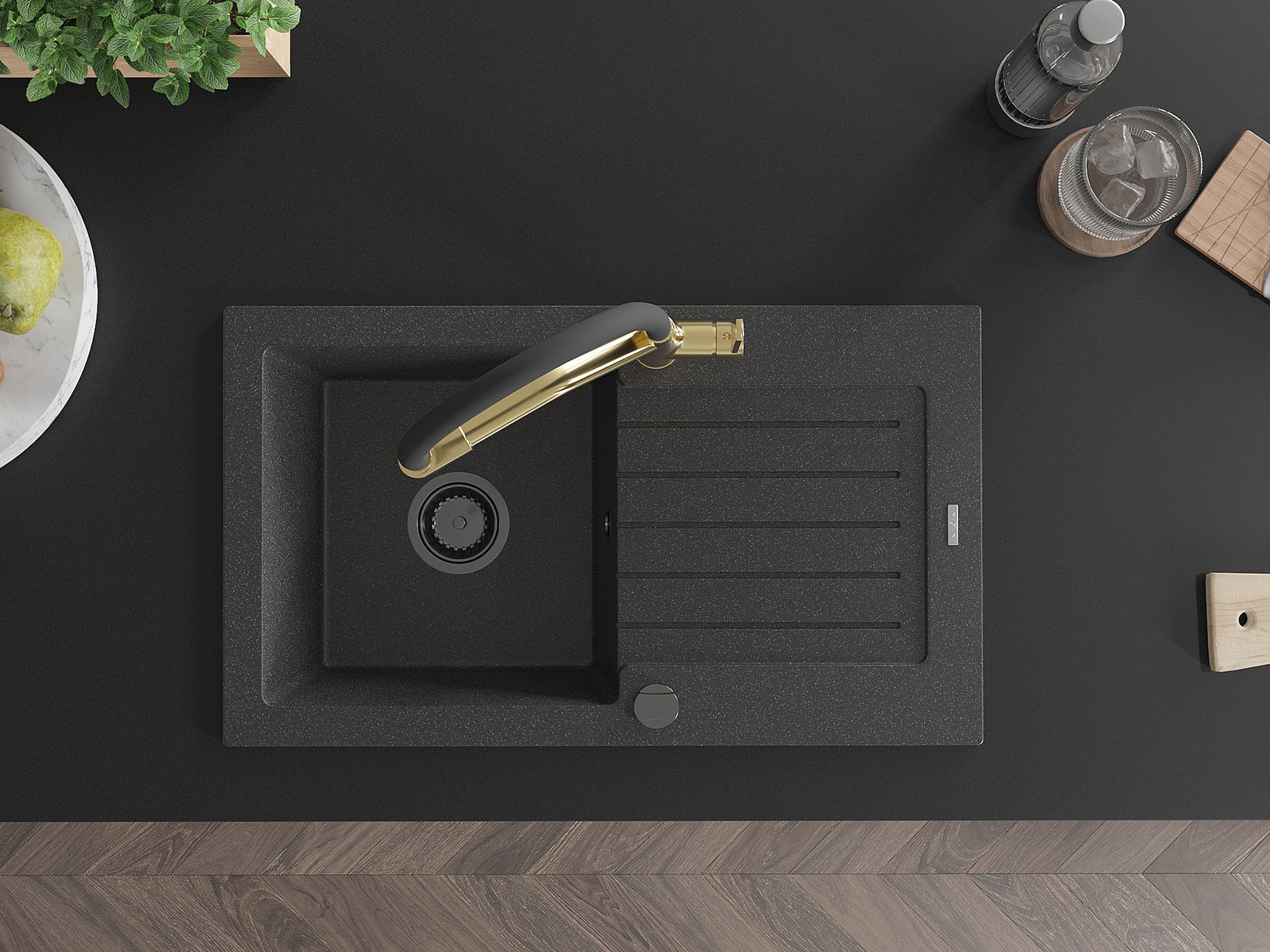 Mexen Pablo žulový drez s 1 komorou s odkvapkávačom a kuchynskou batériou Duo, čierny s bodkami - 6510-76-671701-57-B