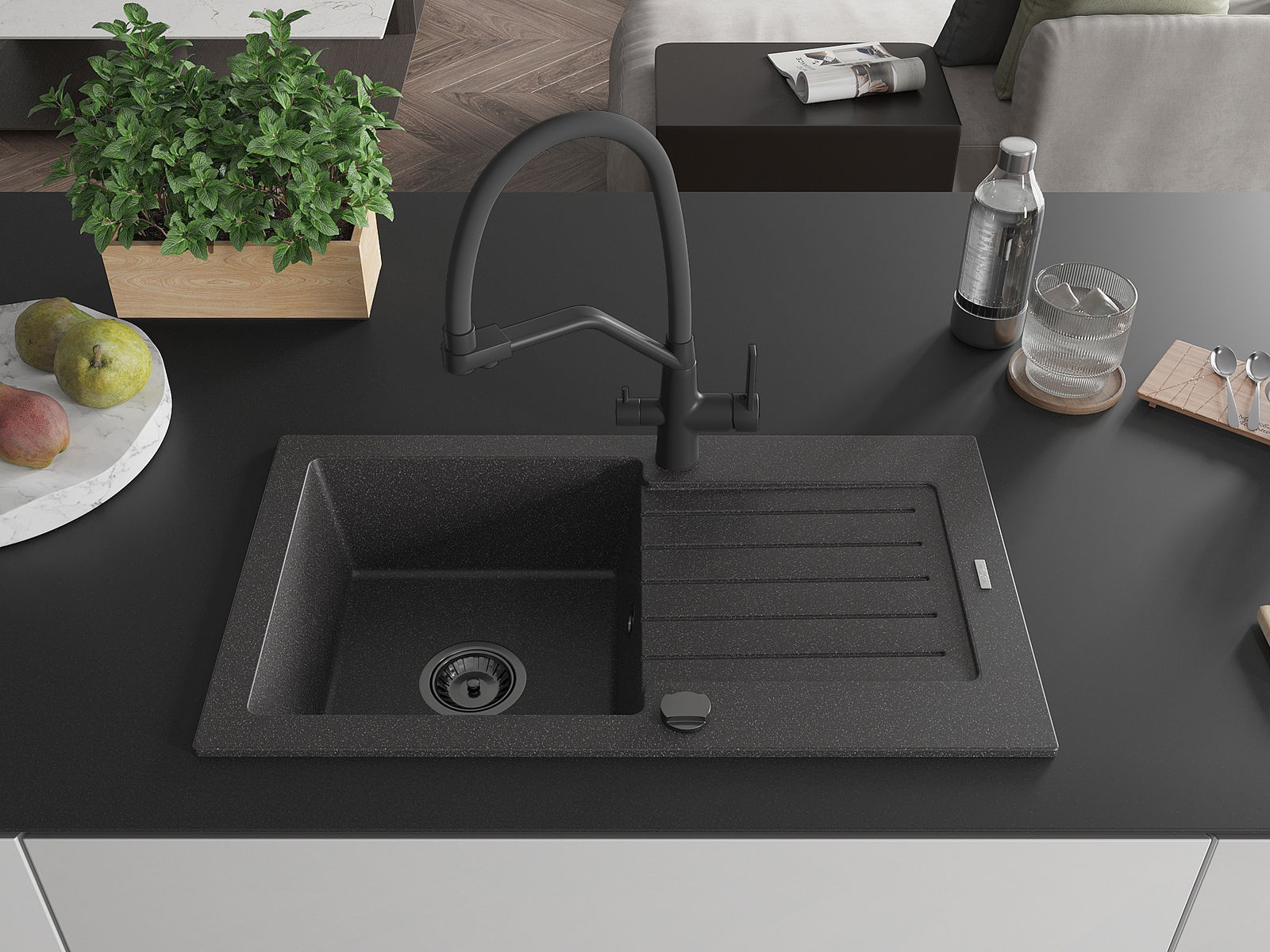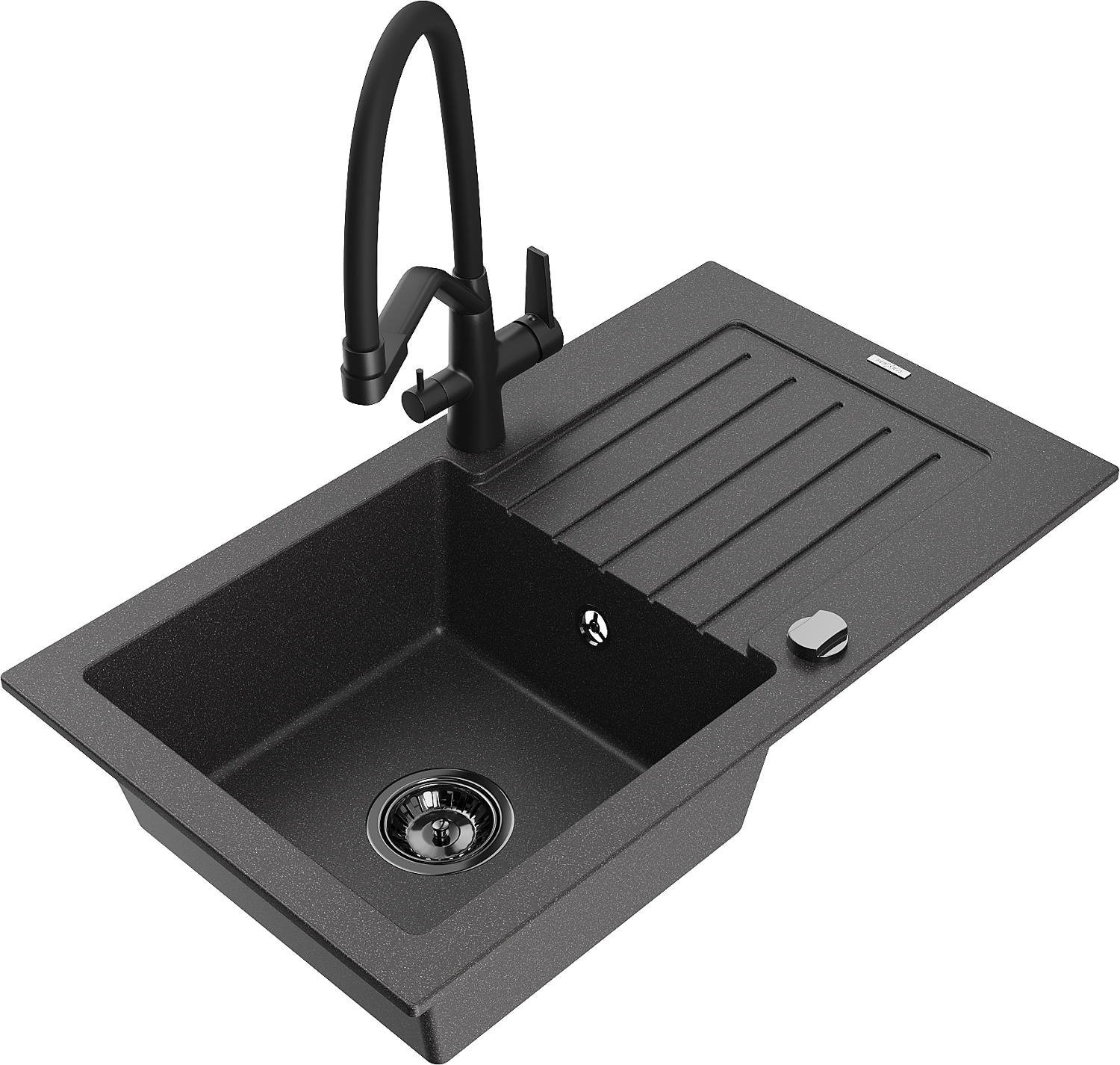 Mexen Pablo granitový drez s 1 komorou a odkvapkávačom a kuchynskou batériou Duo, čierny bodkovaný - 6510-76-671701-70-B