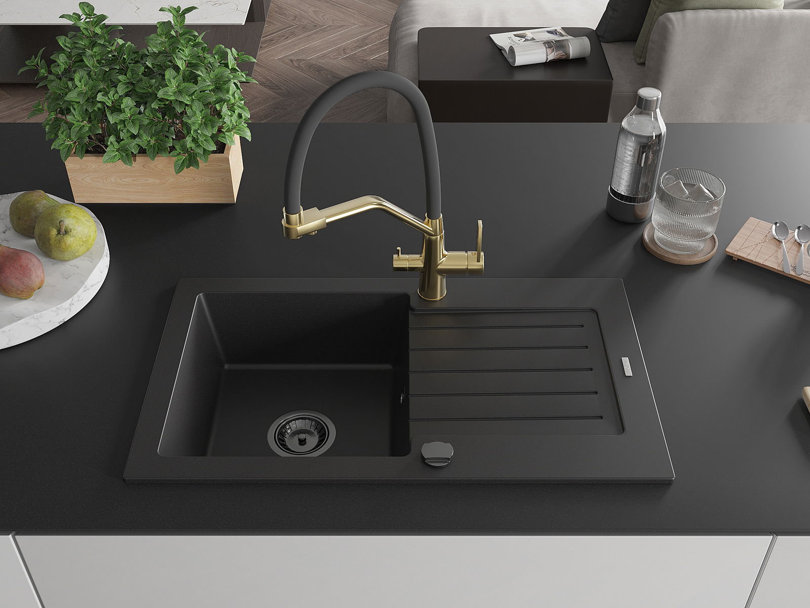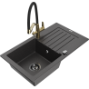 Mexen Pablo žulový drez 1-komorový s odkvapkávacou plochou a kuchynskou batériou Duo, čierny - 6510-77-671701-57-B