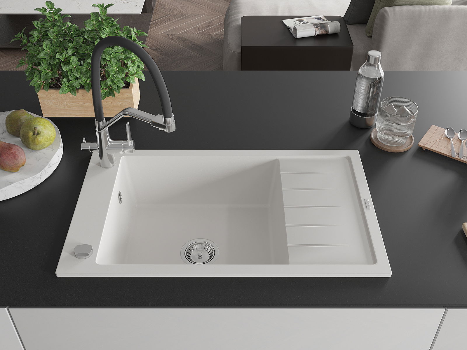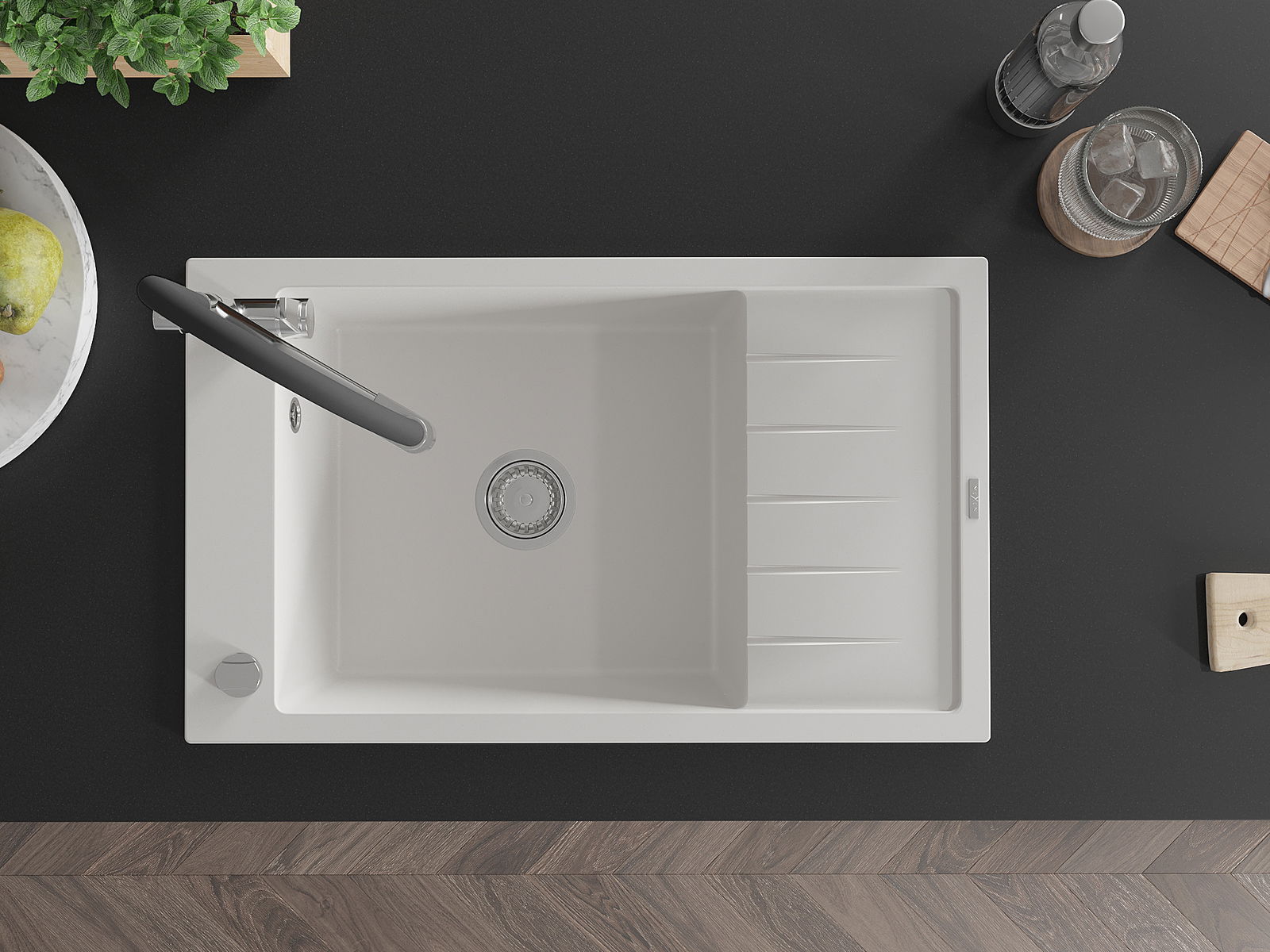 Povrch umývadla je odolný voči škvrnám a sfarbeniu, vďaka čomu sa ľahko čistí a zachováva si svoju farbu po dlhú dobu. Estetický a prakticky dopĺňajúci každú kuchyňu.