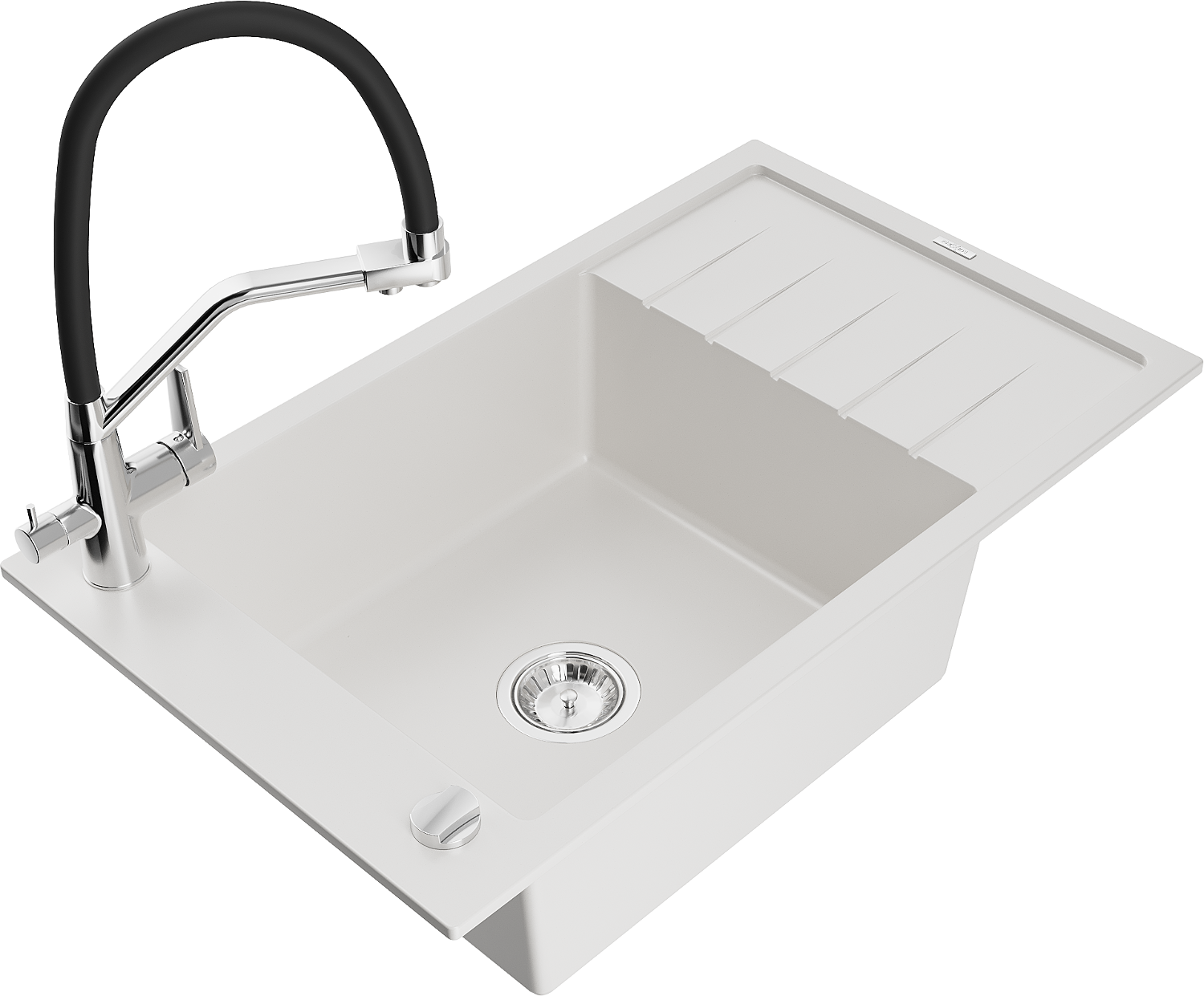 Mexen Elias žulový drez 1-komorový s odkvapkávačom a kuchynskou batériou Duo, biely - 6511-20-671701-07