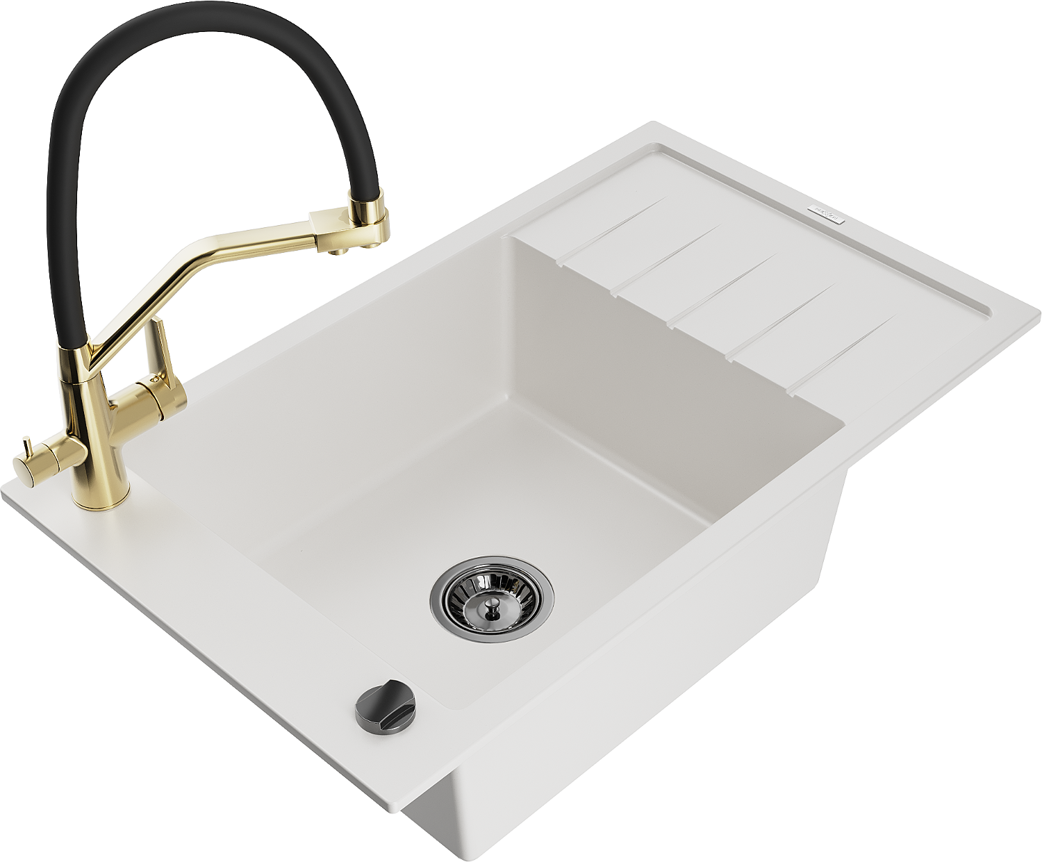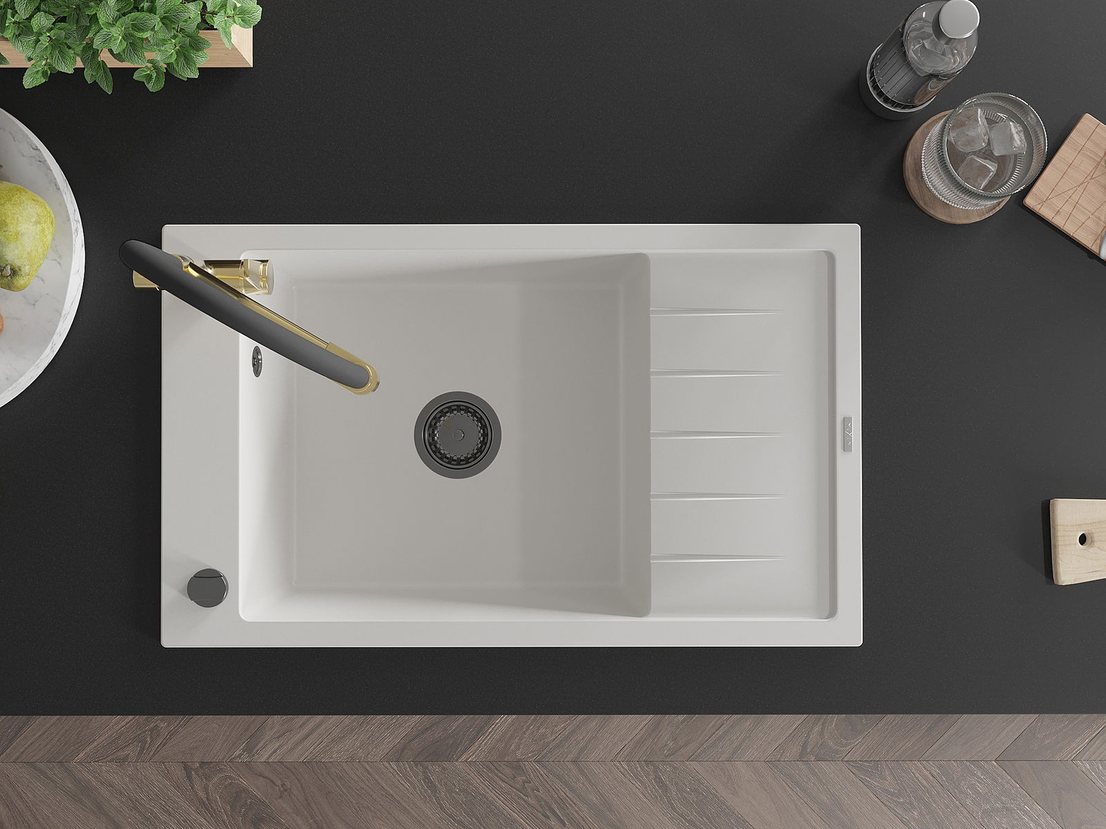 Mexen Elias granitový kuchynský drez s 1-komorou s odkvapkávačom a kuchynskou batériou Duo, biely - 6511-20-671701-57-B