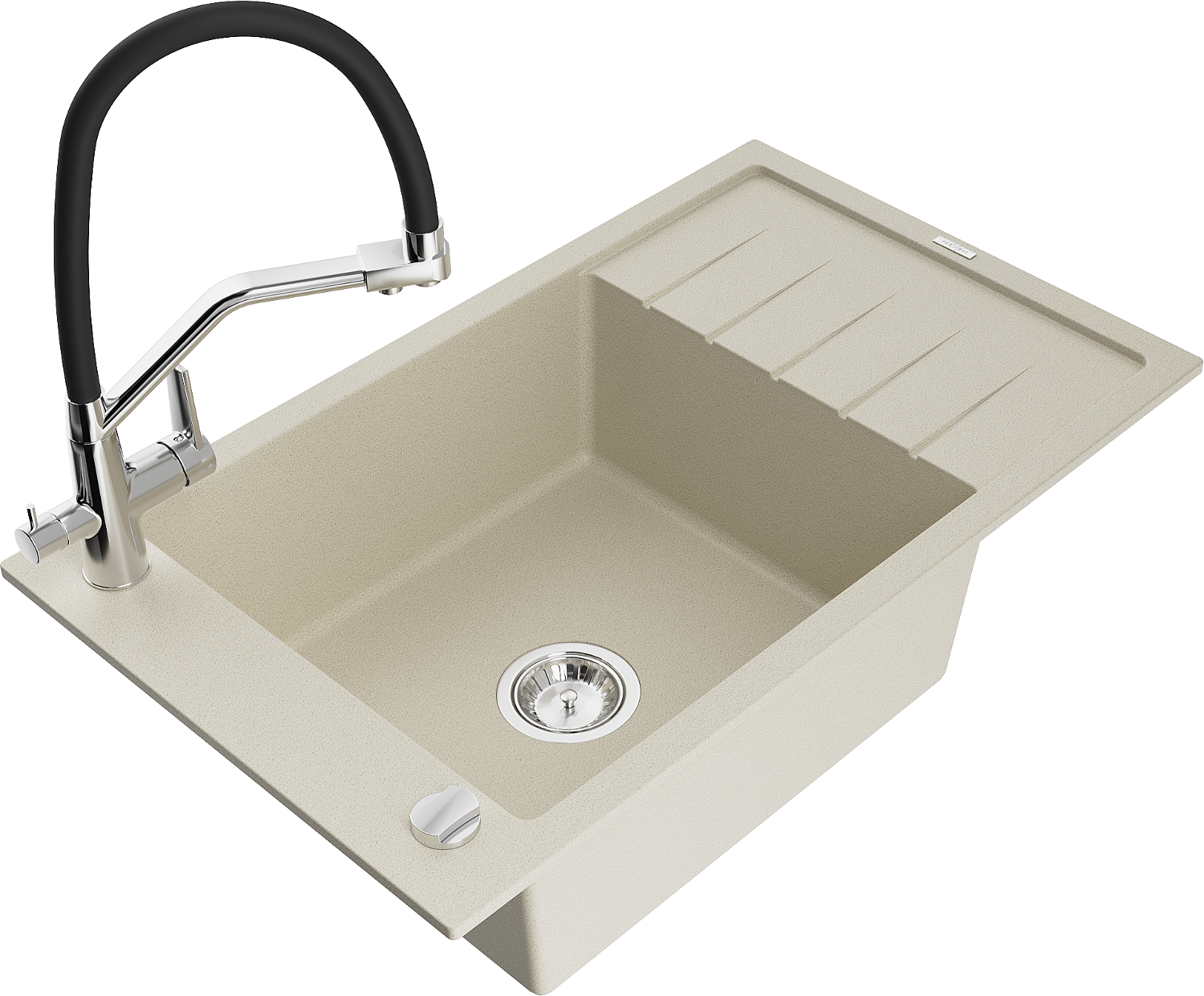 Mexen Elias granitový drez 1-komorový s odkvapkávačom a kuchynskou batériou Duo, béžový - 6511-69-671701-07