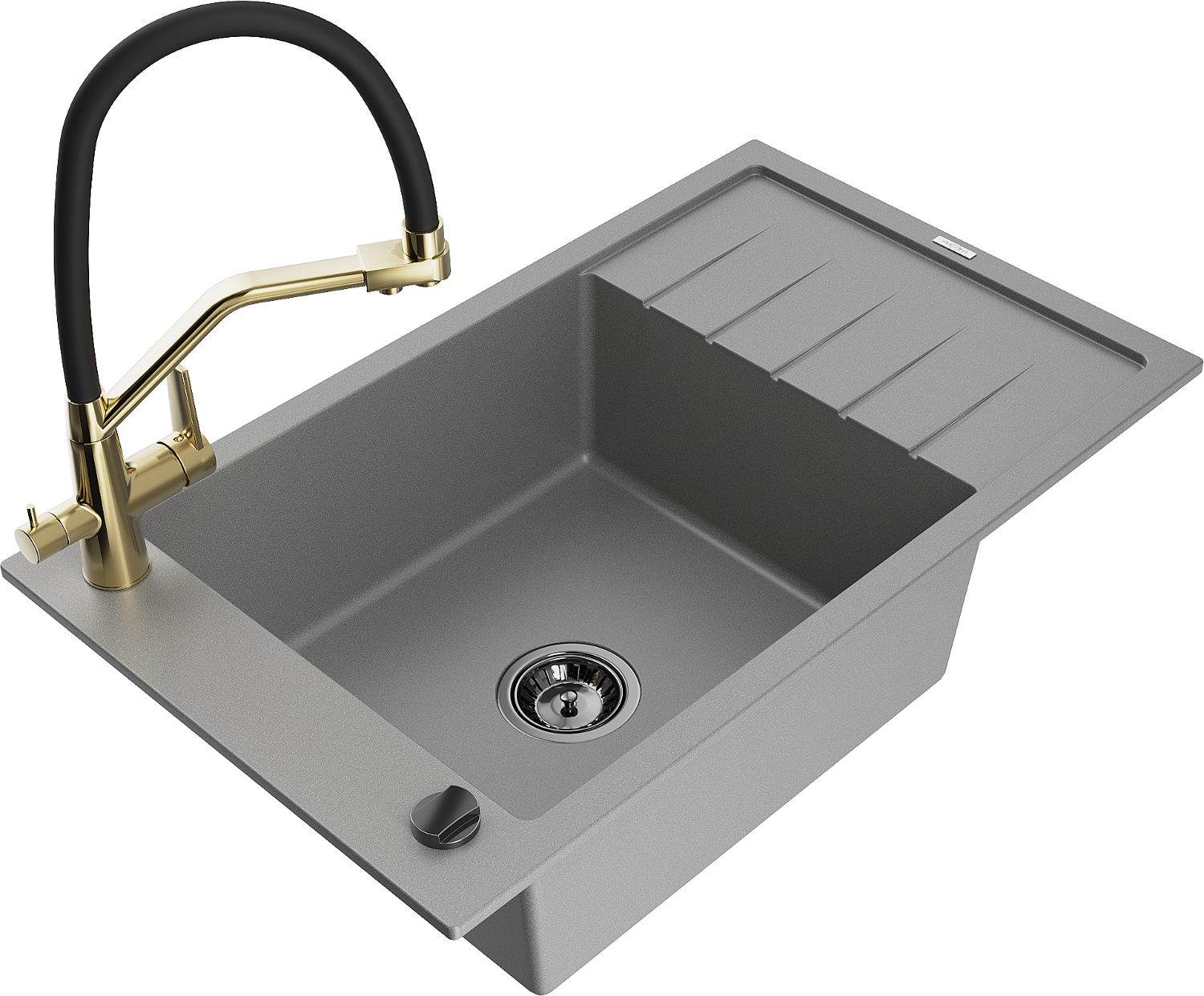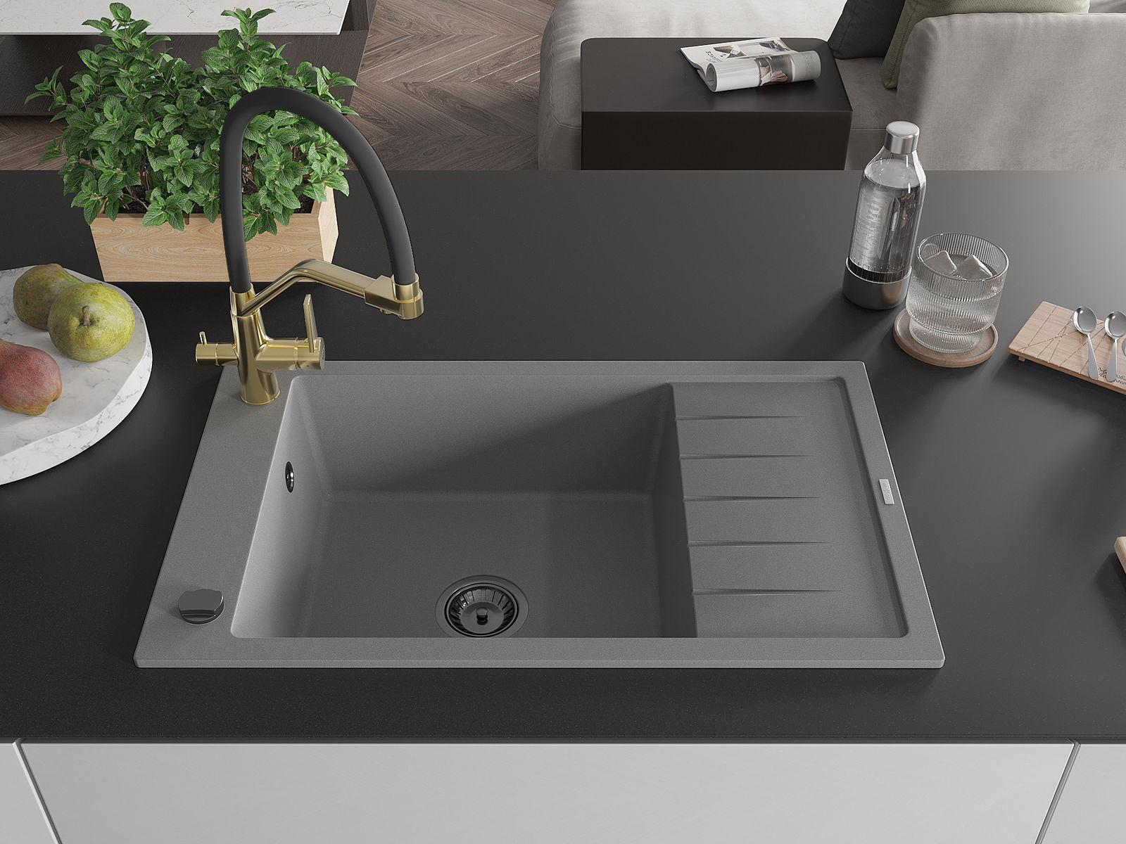 Mexen Elias granitový umývadlo s 1 komorou a odkvapkávačom a kuchynskou batériou Duo, sivý - 6511-71-671701-57-B