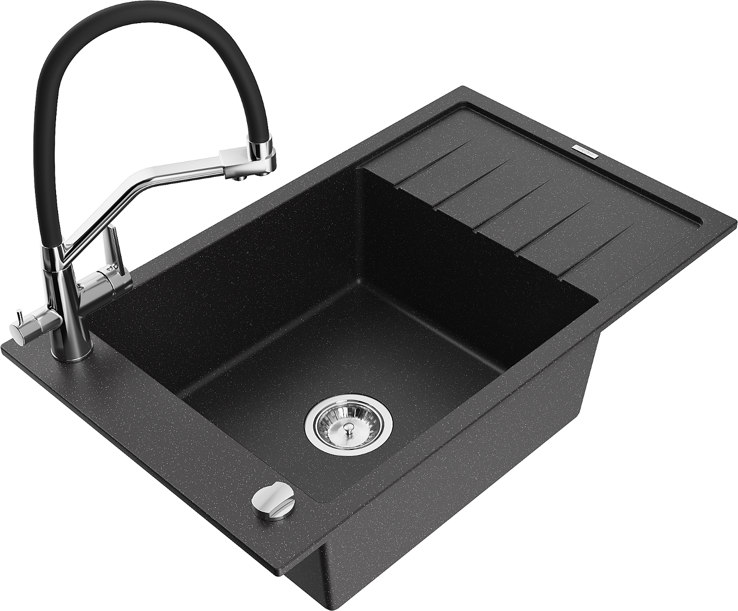 Mexen Elias žulový drez s 1 komorou a odkvapávačom a kuchynskou batériou Duo, čierny/strieborný metalický - 6511-73-671701-07