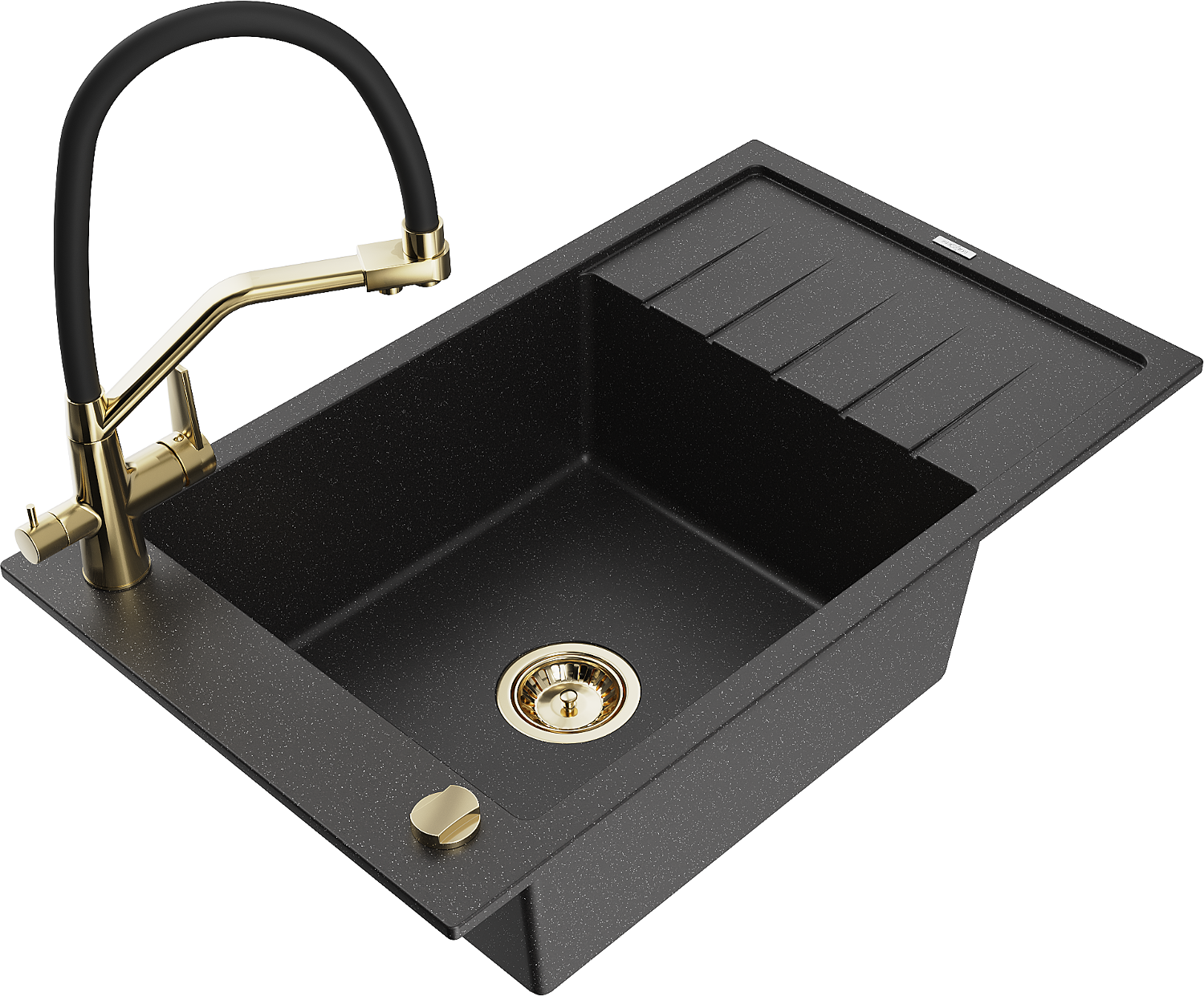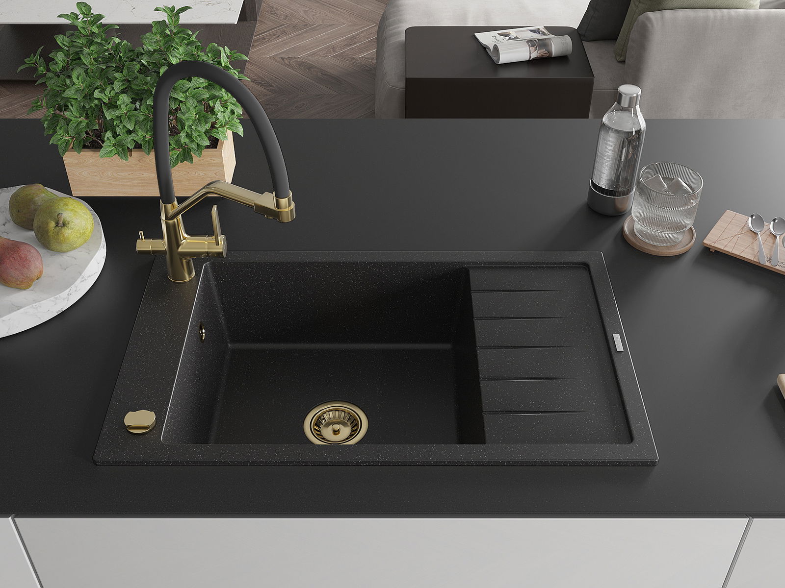 Mexen Elias jednokomorový žulový drez s odkvapkávačom a kuchynskou batériou Duo, čierny/strieborný metalik