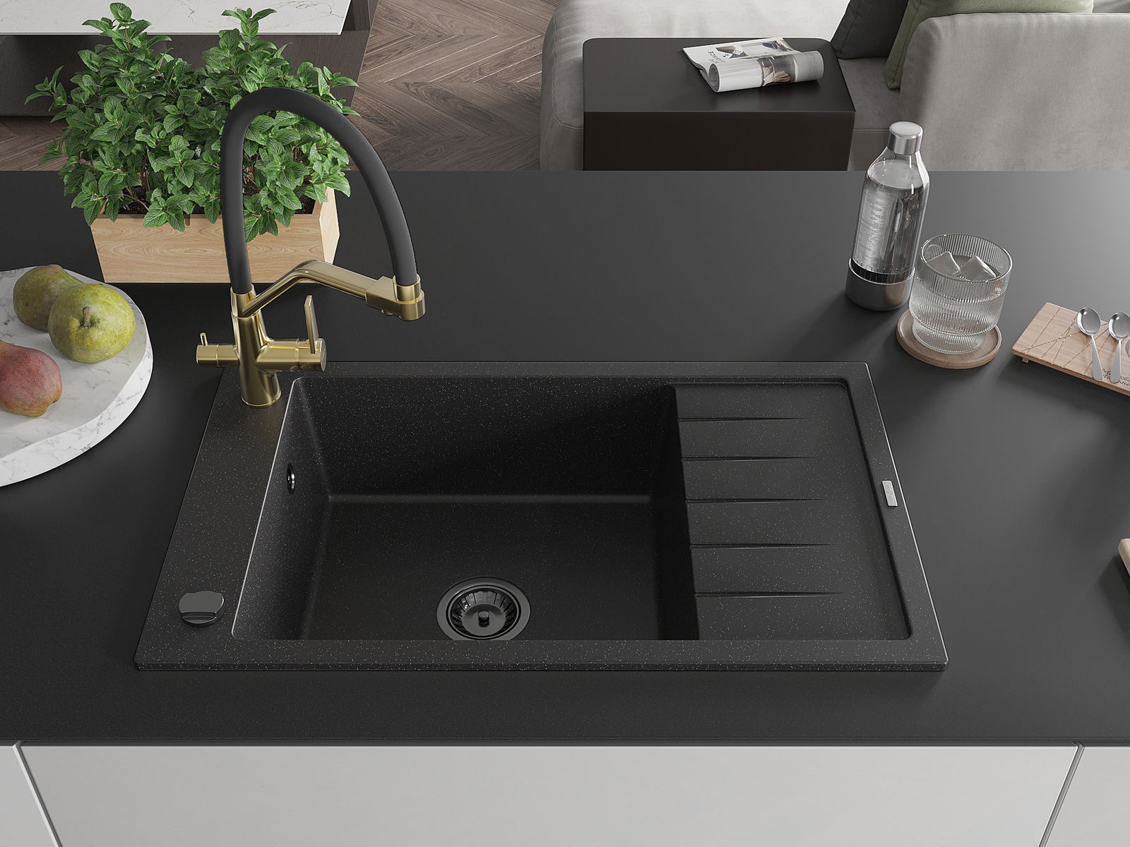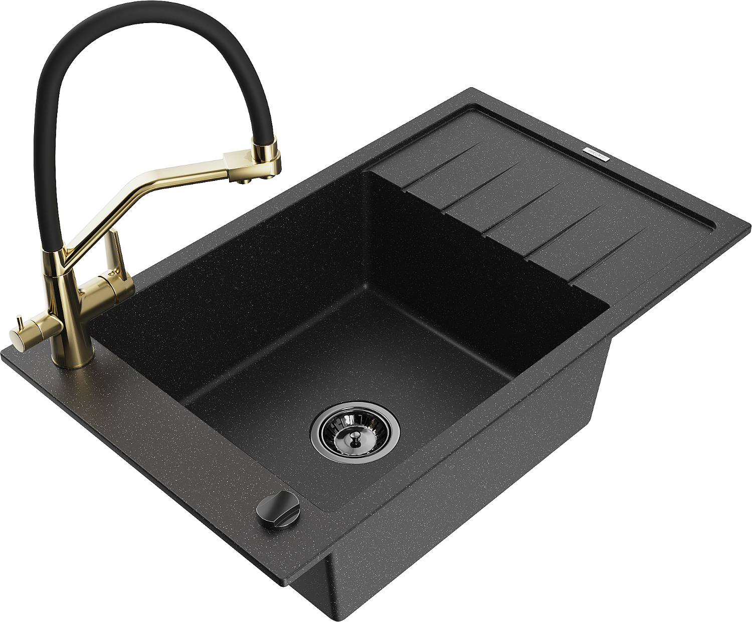 Mexen Elias žulový drez s 1 komorou s odkvapkávačom a kuchynskou batériou Duo, čierny/strieborný metalik - 6511-73-671701-57-B