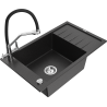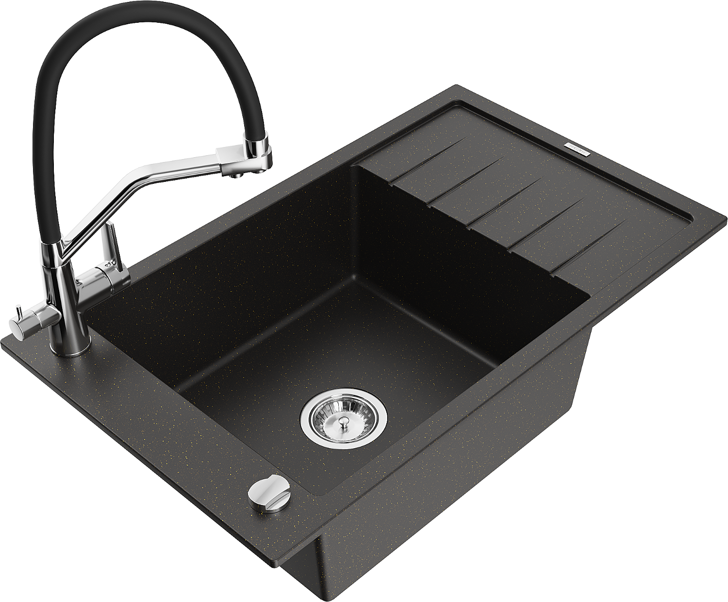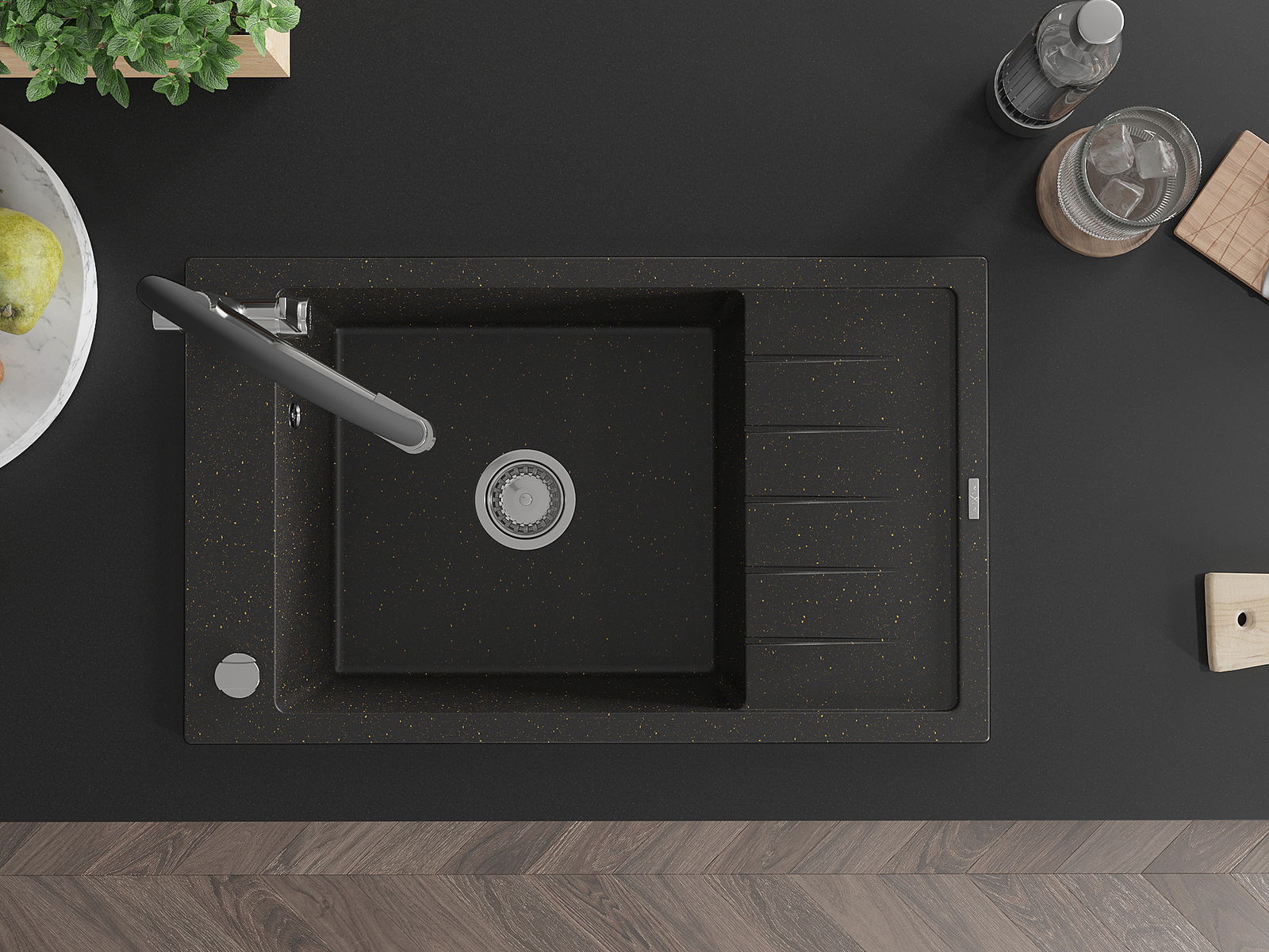 Mexen Elias granitový drez s 1 komorou s odkvapkávačom a kuchynskou batériou Duo, čierna/zlatý metalický