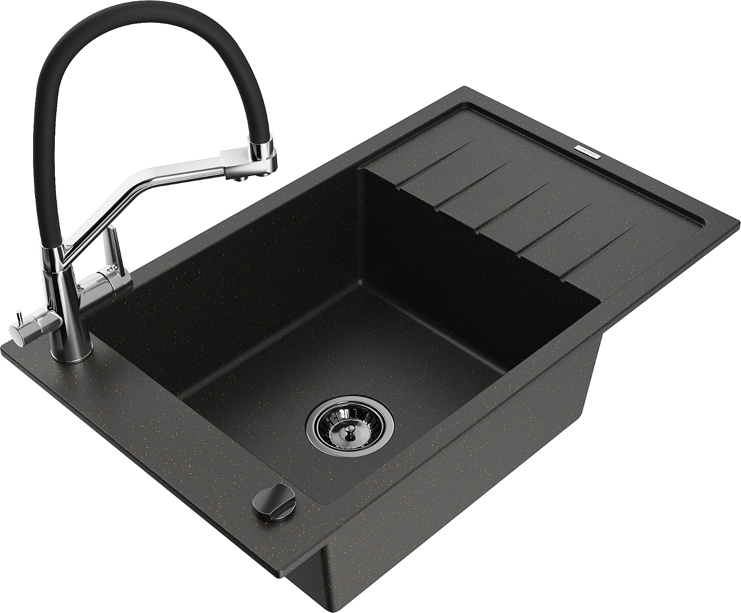 Mexen Elias granitový drez s 1 komorou, odkapávačom a kuchynskou batériou Duo, čierny/zlatý metalík - 6511-75-671701-07-B