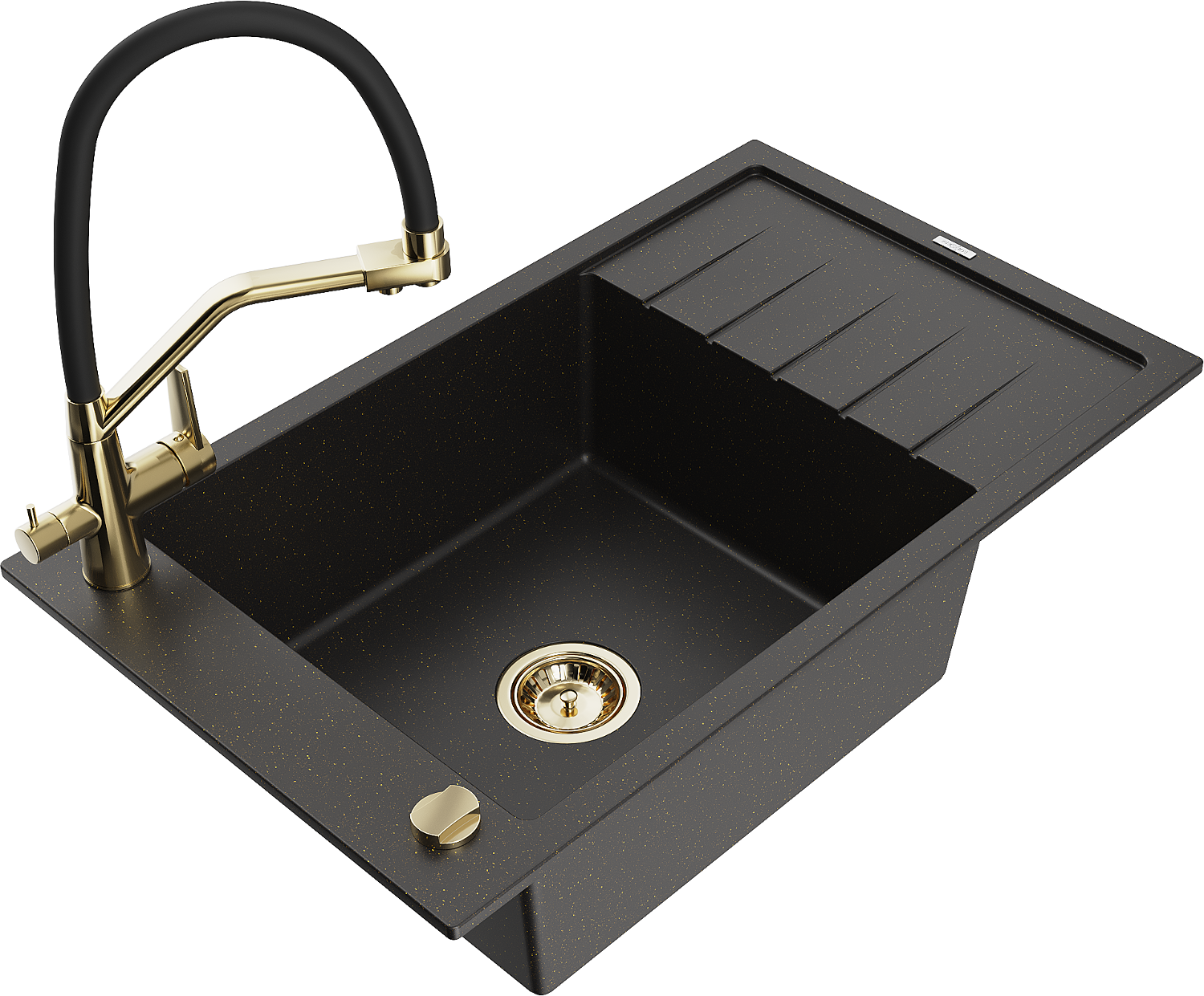 Mexen Elias granitový kuchynský drez s 1 komorou, s odkvapkávačom a kuchynskou batériou Duo, čierny/zlatý metalický