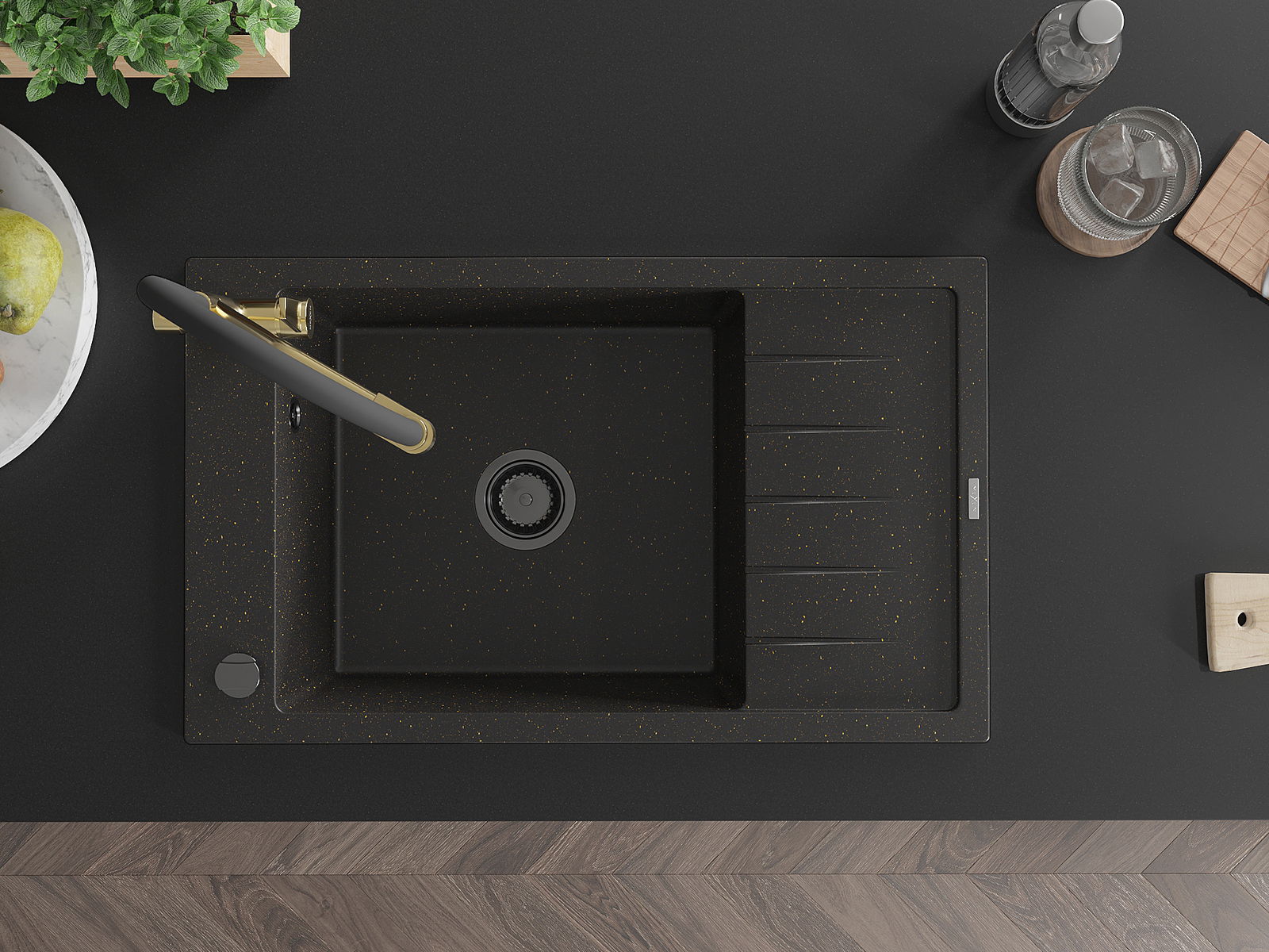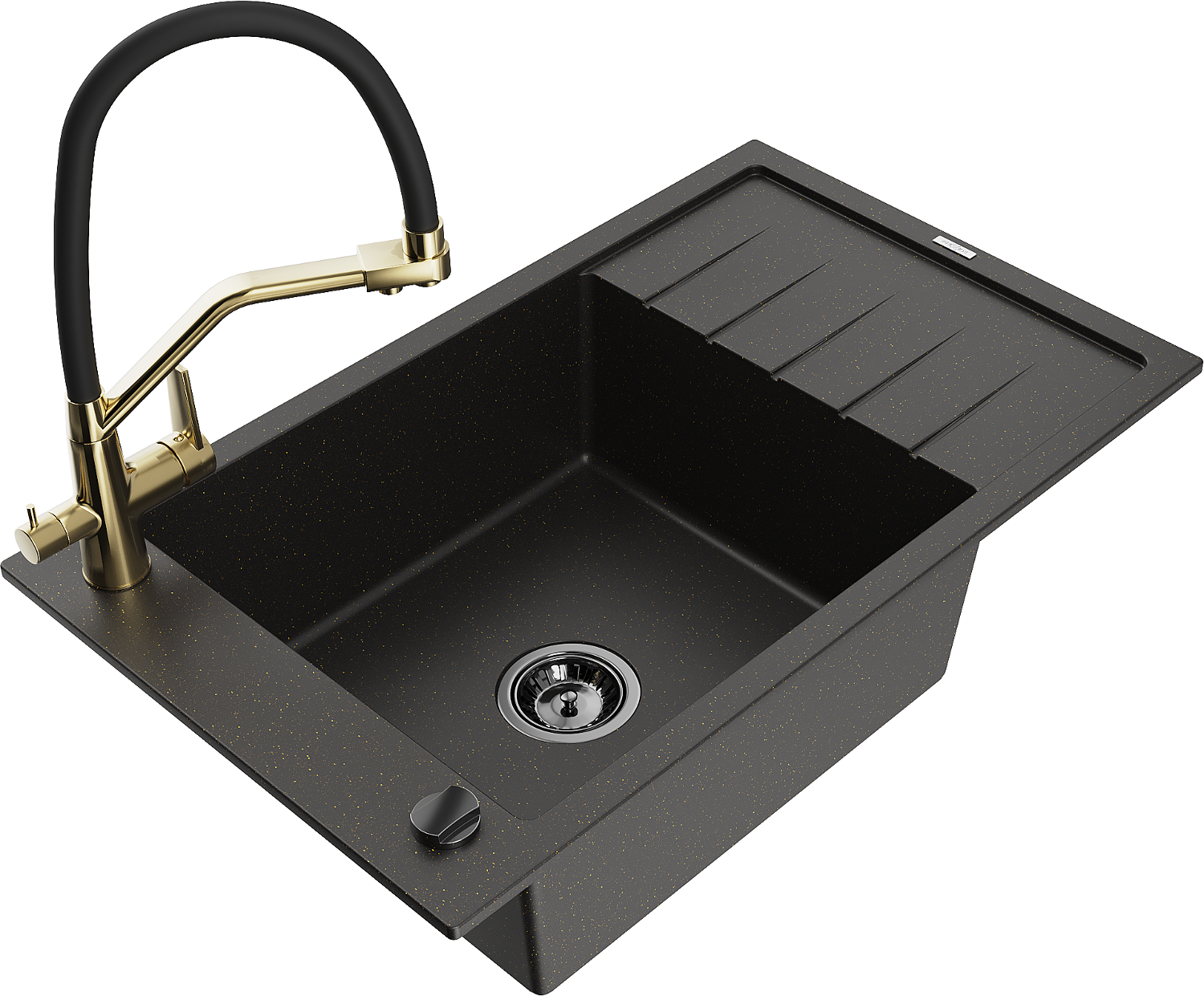 Mexen Elias jednodrezový granitový drez s odkvapkávačom a kuchynská batéria Duo, čierny/zlatý metalický