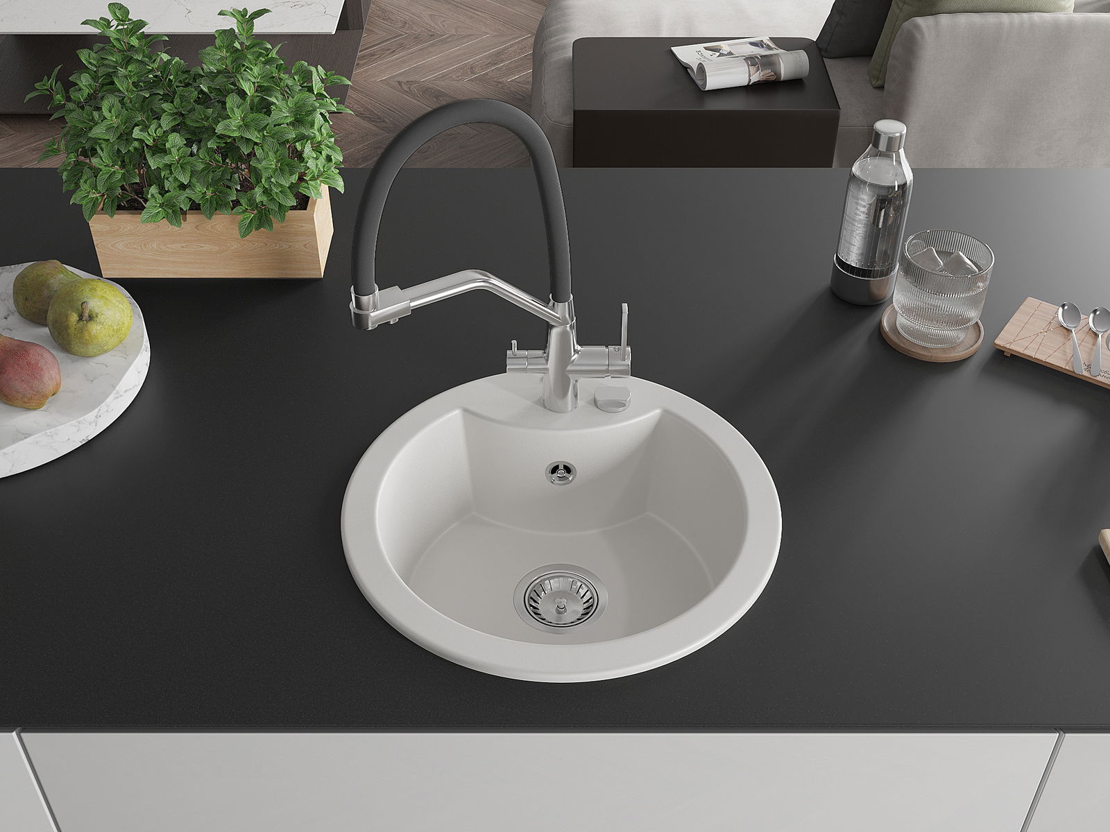 Povrch umývadla je odolný voči škvrnám a sfarbeniu, vďaka čomu sa ľahko čistí a zachováva si svoju farbu po dlhú dobu. Estetický a prakticky dopĺňajúci každú kuchyňu.