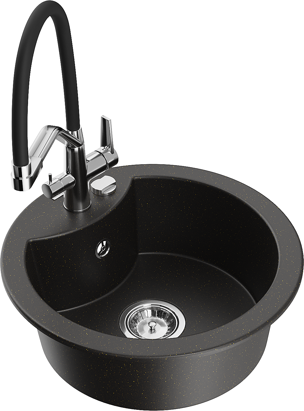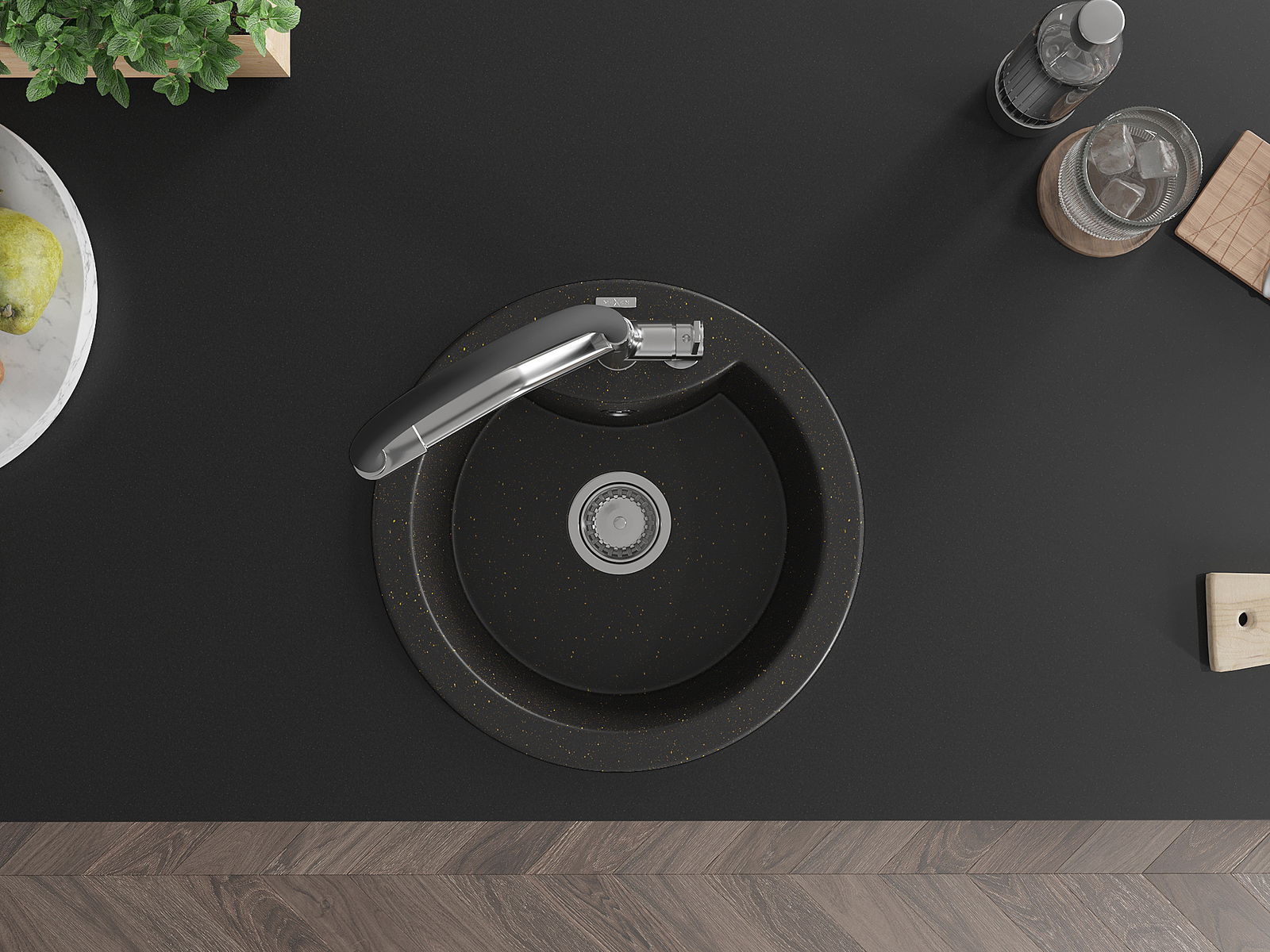 Mexen Diego žulový drez 1-komorový s kuchynskou batériou Duo, čierny/zlatý metalík - 6512-75-671701-07