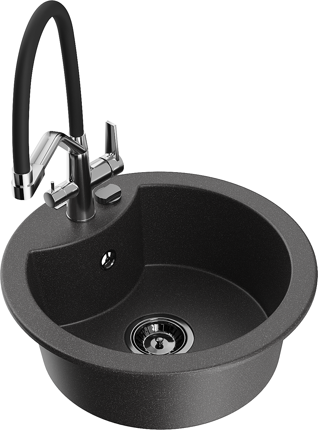Mexen Diego granitový kuchynský drez s jednou komorou a kuchynskou batériou Duo, čierny s fŕkaním - 6512-76-671701-07-B