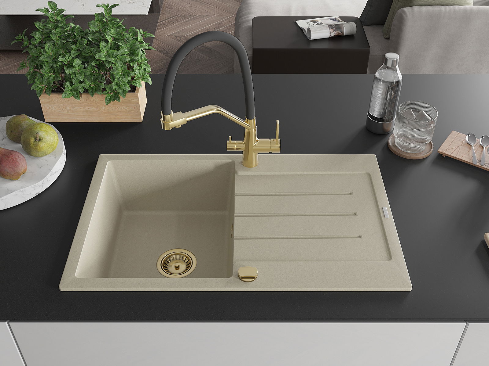 Mexen Bruno žulový kuchynský drez s 1 komorou s odkvapkávačom a kuchynskou batériou Duo, béžový - 6513-69-671701-57-G
