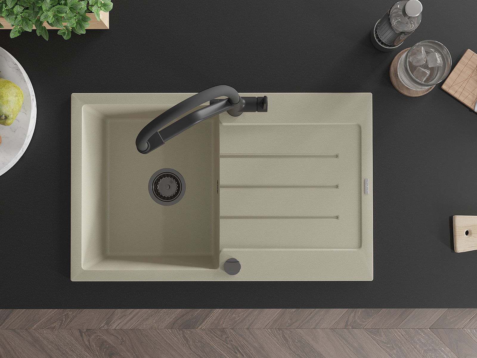Povrch kuchynského drezu je odolný voči škvrnám a zafarbeniu, vďaka čomu sa ľahko udržiava a zachováva svoju farbu počas dlhého obdobia používania. Estetický a praktický doplnok pre každú kuchyňu.