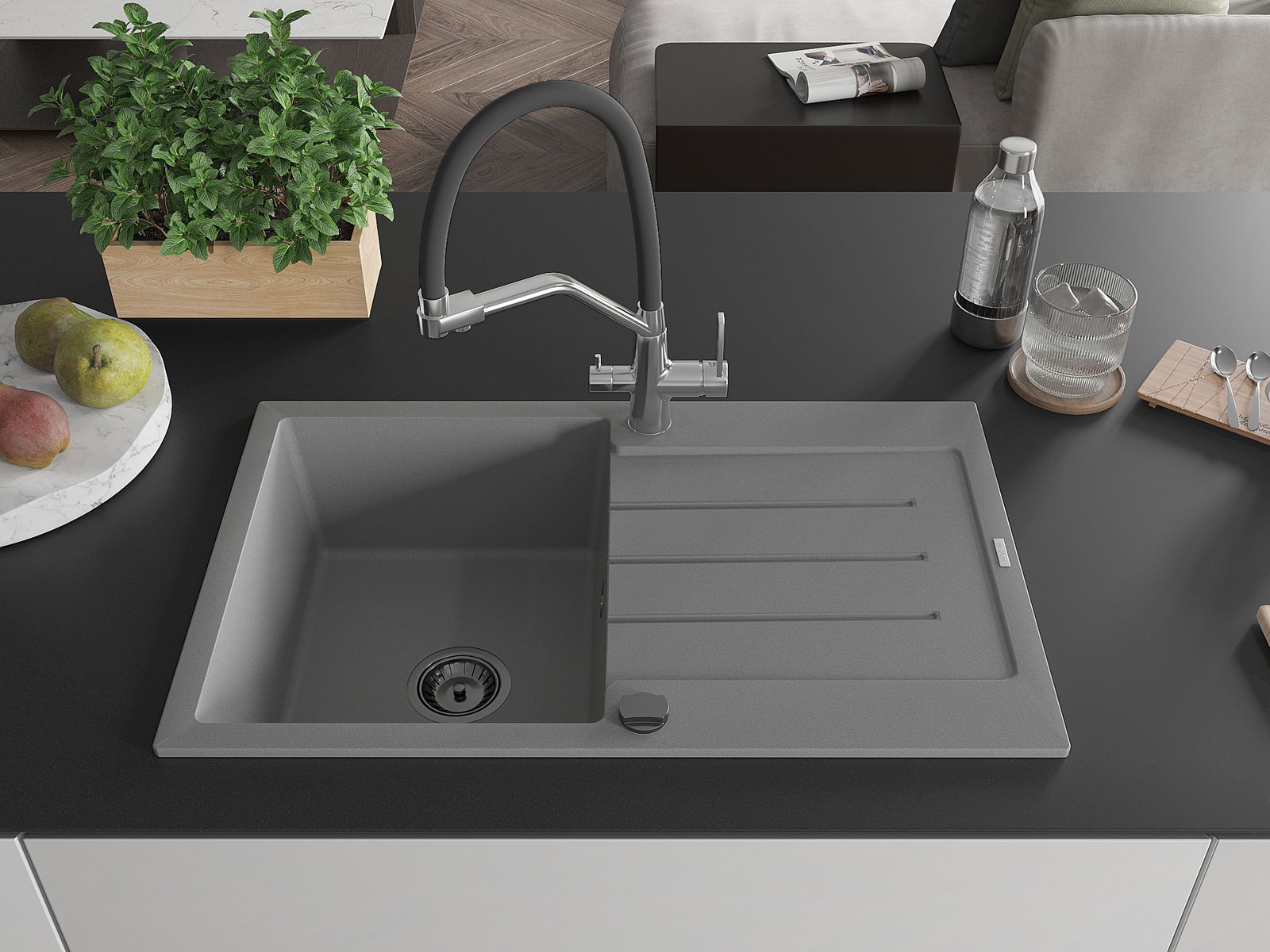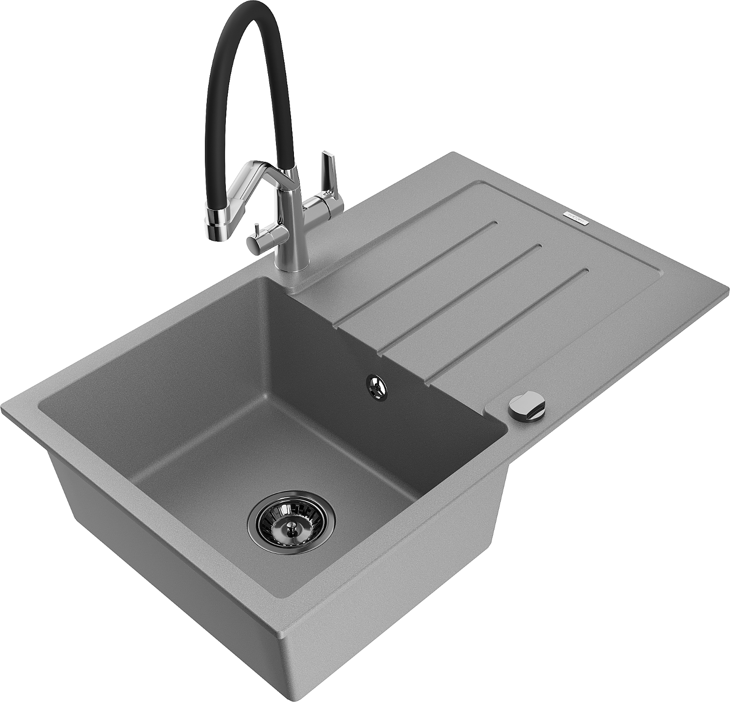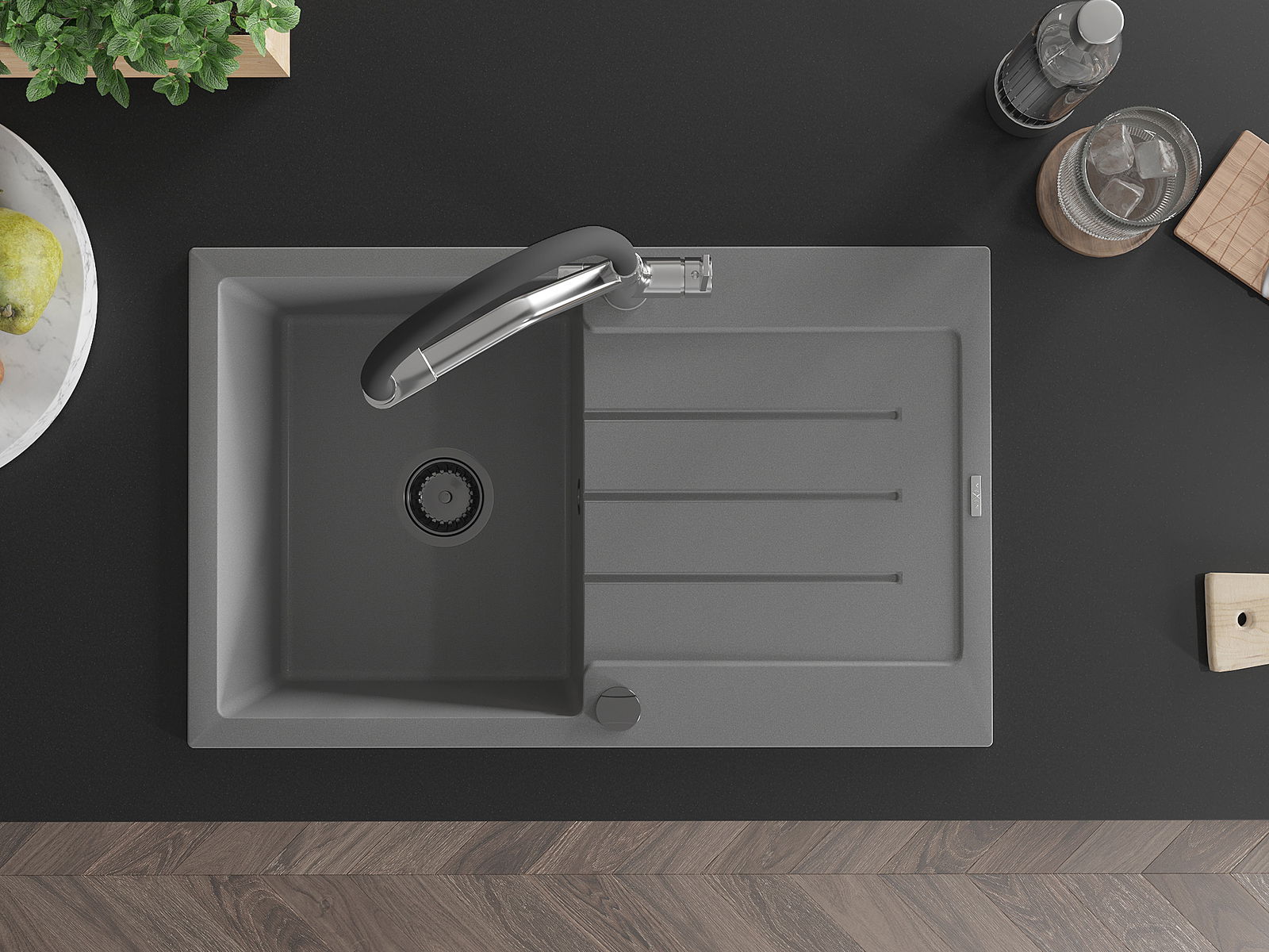 Mexen Bruno granitový drez 1-komorový s odkvapkávačom a kuchynskou batériou Duo, sivý - 6513-71-671701-07-B